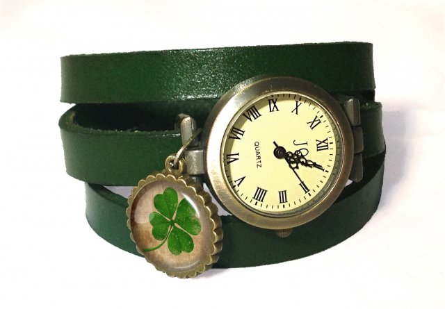Zegarek ze skórzanym paskiem kilkakrotnie zakręcanym na ręku z ręcznie robioną zawieszką (kaboszonem).
