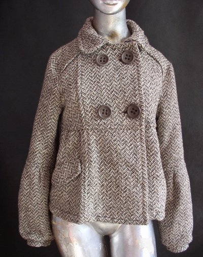 Krótka kurtka w brązowo-białą jodełkę.Materiał grubo tkany 30%akryl + 30% poliester + 30% wełna + 10% nylon.Rozmiar M.Podszewka brązowa,syntetyk.Kołnierz okrągły.Zapinany z przodu na dwa guziki + dwa przyszyte dla ozdoby + w środku duża hafta.Odcięta pod biustem.Dół lekko marszczony z dwoma kieszeniami,przykrytymi klapką.Z tyłu dwie patki.Rękaw długi na środku odcięty,dolna część marszczona,zakończona mankietem.Stan dobry+.Długość 55 cm.pod pachami 94 cm.