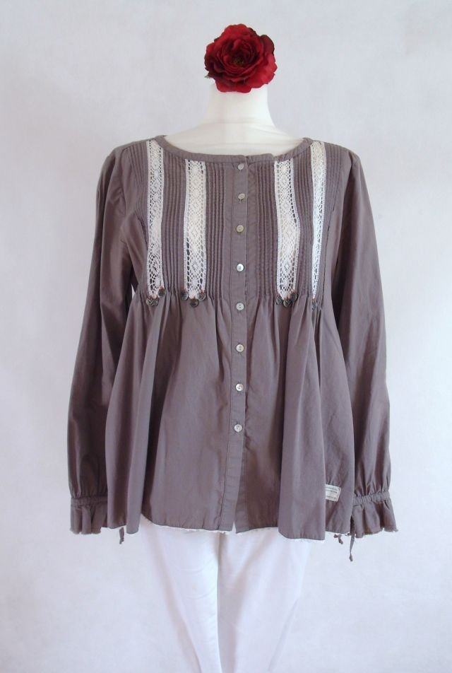cztery ciuszki - biały cienki sweter ozdobiony u dołu koronką (luźny), bluzka w kolorze taupe firmy Odd Molly, ozdobiona koronką i bordową wstążką, t-shirt christian berg - beżowy w białe grochy oraz spódnica Lau Rie beżowa w granatowe kwiaty, fason jeansowy.
