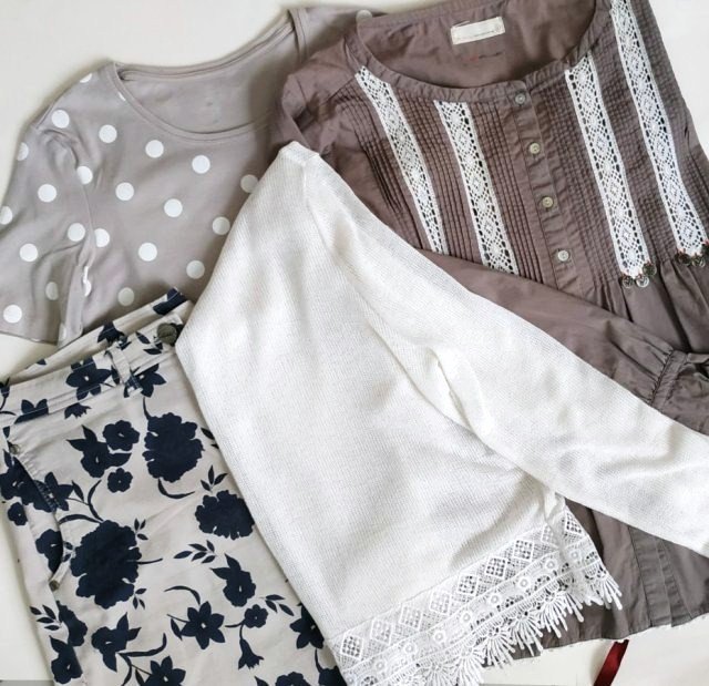 cztery ciuszki - biały cienki sweter ozdobiony u dołu koronką (luźny), bluzka w kolorze taupe firmy Odd Molly, ozdobiona koronką i bordową wstążką, t-shirt christian berg - beżowy w białe grochy oraz spódnica Lau Rie beżowa w granatowe kwiaty, fason jeansowy.