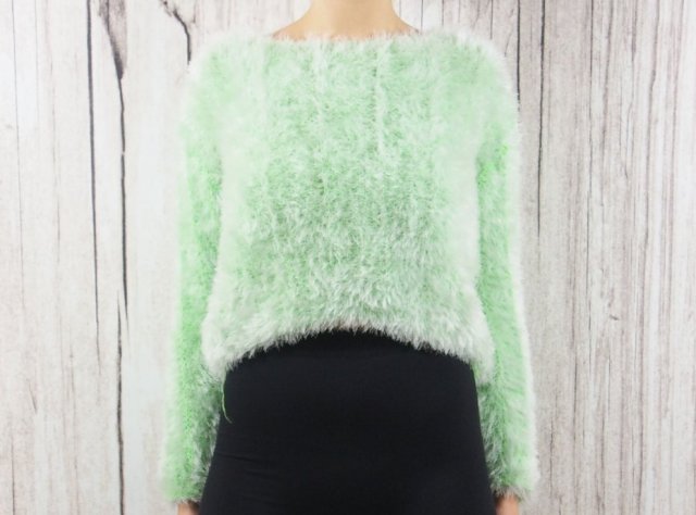 Przemilutki przecieplutki prześwietny. Krótki puchacz w kolorze fluozieleni z białymi włoskami.