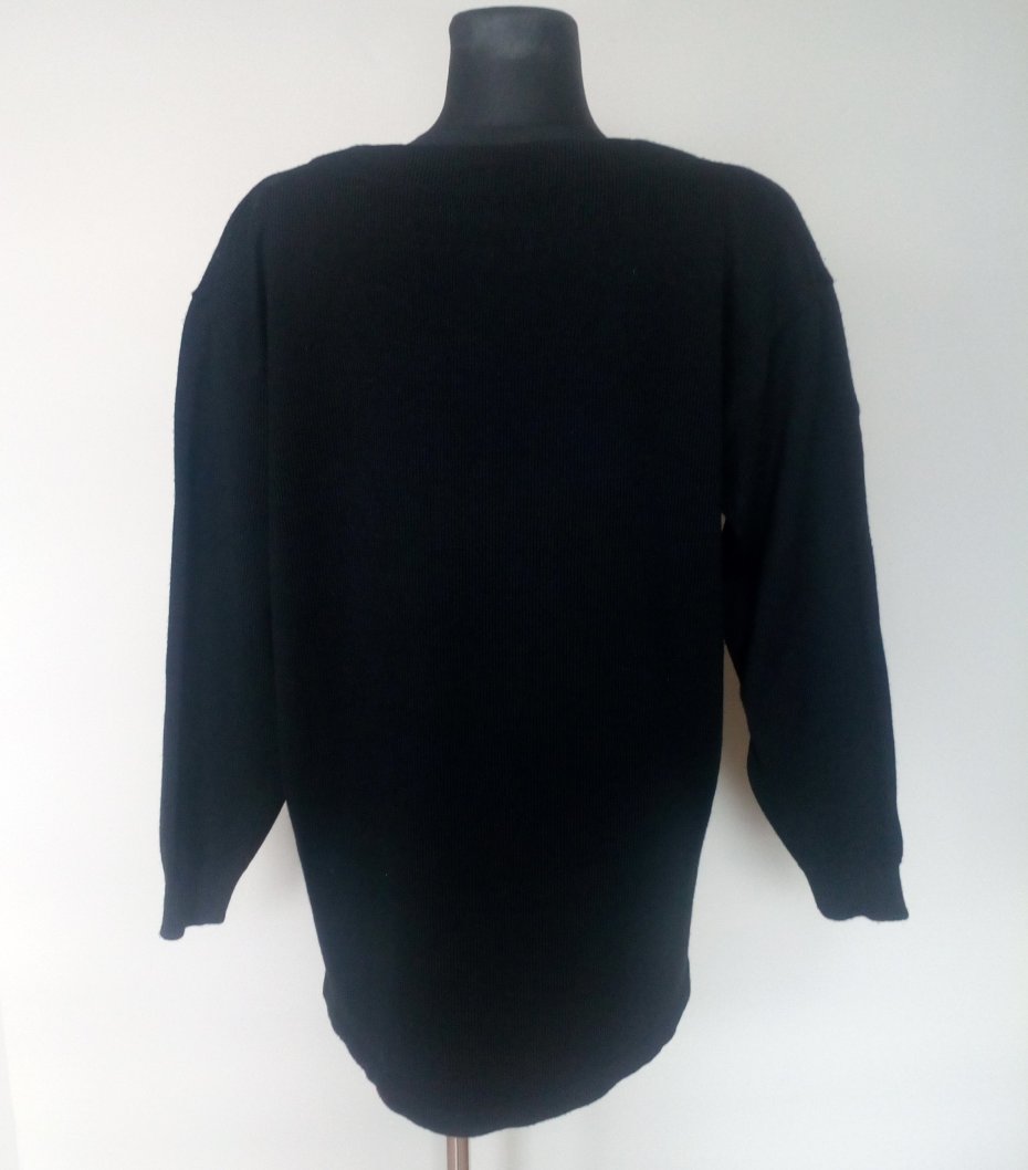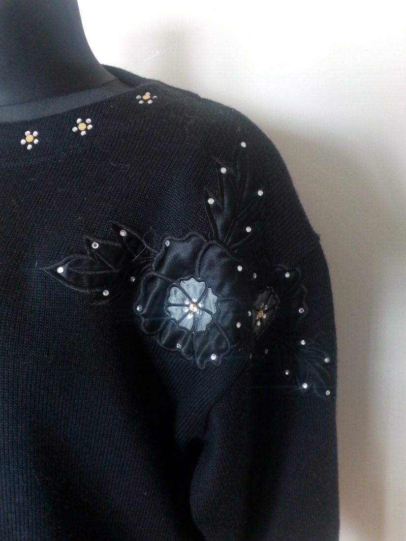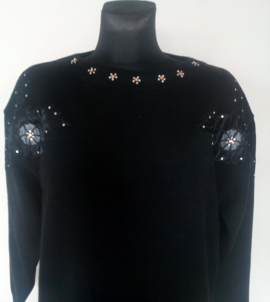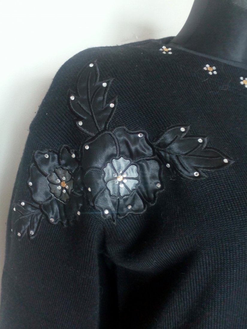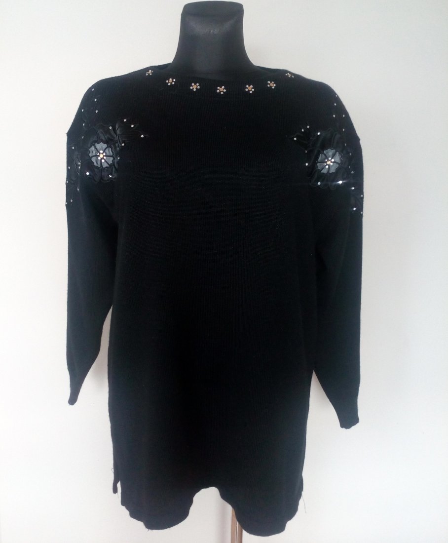 Czarny sweter z udziałem wełny merynosów, zdobiony aplikacjami i cyrkoniami w bialym i zlotym kolorze, na ramionach poduszki latwe do usunięcia, boki swetra lekko rozcięte