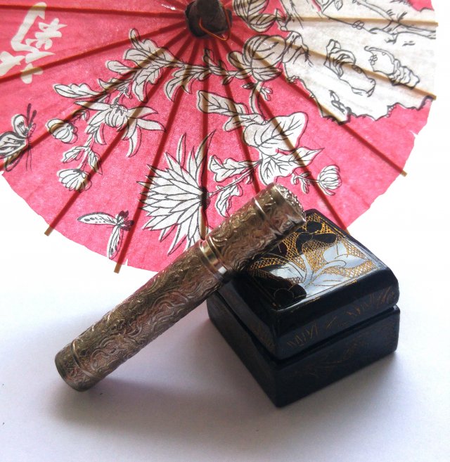 Dalekowschodnie drobiazgi- pudełko czarne grawerowane i złocone ręcznie wykonane techniką papier mache. Etui metalowe na talk, pudry zapachowe itp. Pudełeczko 3,5cmx3,5cm, etui długość 7cm