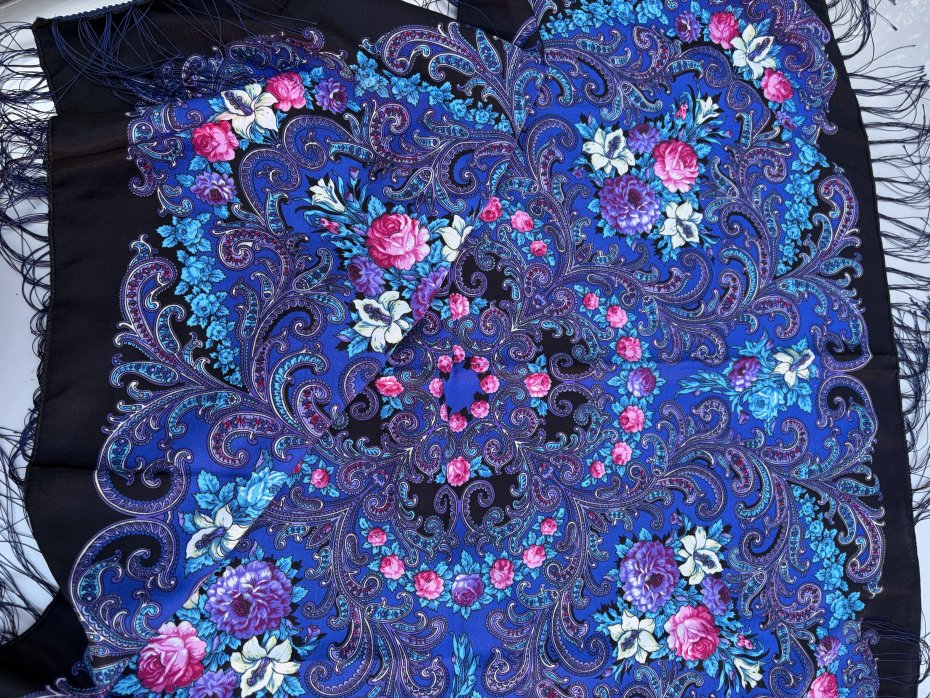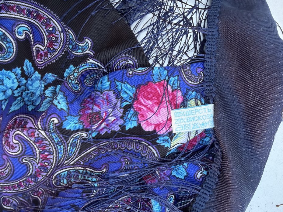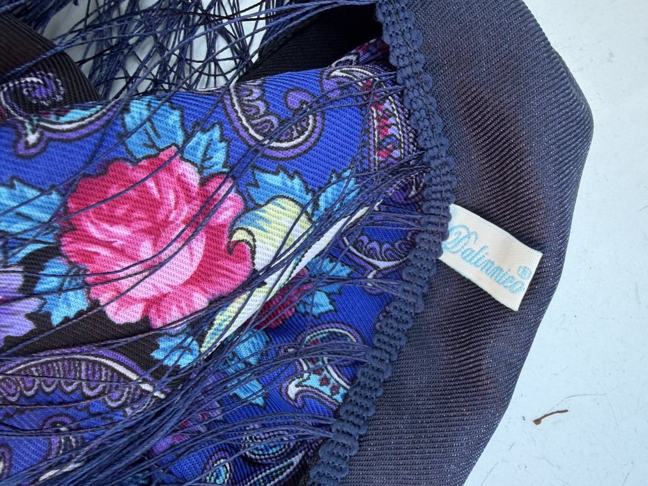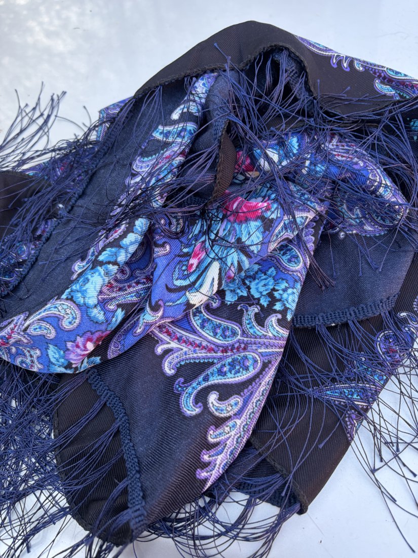 Duża efektowna chusta DALLINICO 80 % wełny 20 % wiskozy . Folkowa z jedwabnymi frędzlami . Niesamowite i niespotykane złożenie barw. 90 c 90 frędzle około 10 cm Stan zachowania bardzo dobry . Metka firmowa i ze składem obecna .