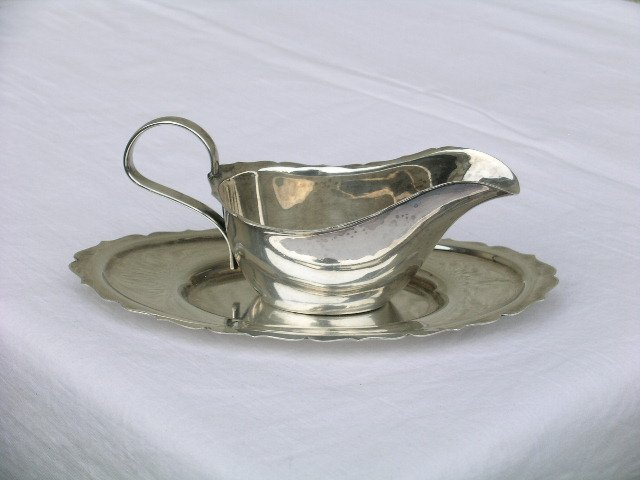 Elegancki platerowy zestaw sosjerki z podstawko-tacką. Z memorandum w setną rocznicę śmierci szkociego arystokraty z domu Dalmahoy :) Delikatne falbanowanie i przyjemny połysk plateru. W dobrym stylu. Dół 5; szer.13; wys. 9 cm. Stan zachowania bardzo dobry.
