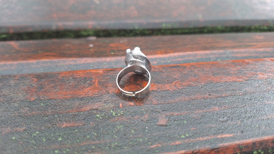 Pierścionek wykonany z miedzi, cyny i jaspisu. Wymiary ok. 2 na 1.5 cm. Regulowany. Nie jest ciężki.