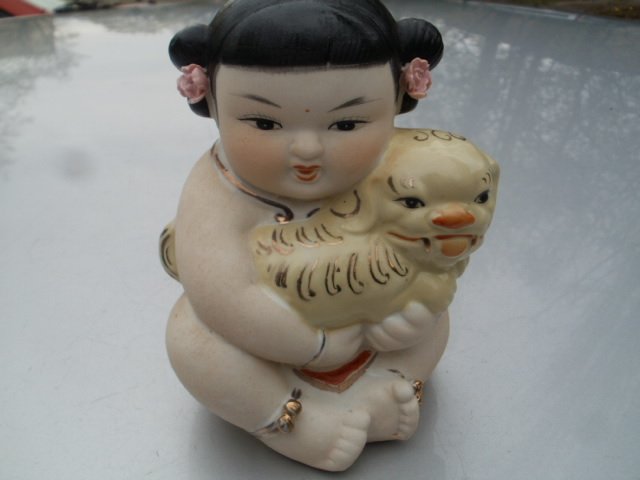Japan style, oryginalna porcelanowa figurka.Nie sygnowana, bardzo dobrze wykonana . ręcznie malowana. Połączenie wykończeń od matowego biskwitowe go, poprzez satynowe /włosy / do błyszczącego / piesek / ...złocenia ...to wręcz unikatowe . Japońska stylistyka, kolory wyraziste i subtelne zarazem. Cudeńko do kolekcji I na ciekawy prezent;) kwiaty we włosach i branzoletka na nodze to majstersztyk ;) 7 x 7,5 x 10,5 podstawa 5,5 x 4,5 Stan zachowania bardzo dobry minus. Minimalne ślady użytkowania.