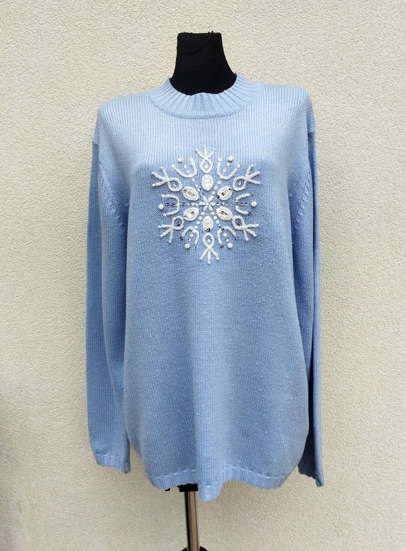 Ładny sweter z akrylowej włóczki w błękitnym kolorze z piękną wyszywaną aplikacją z białej włóczki zdobioną perełkami i srebrnymi cekinami. Wykończony ściągaczami