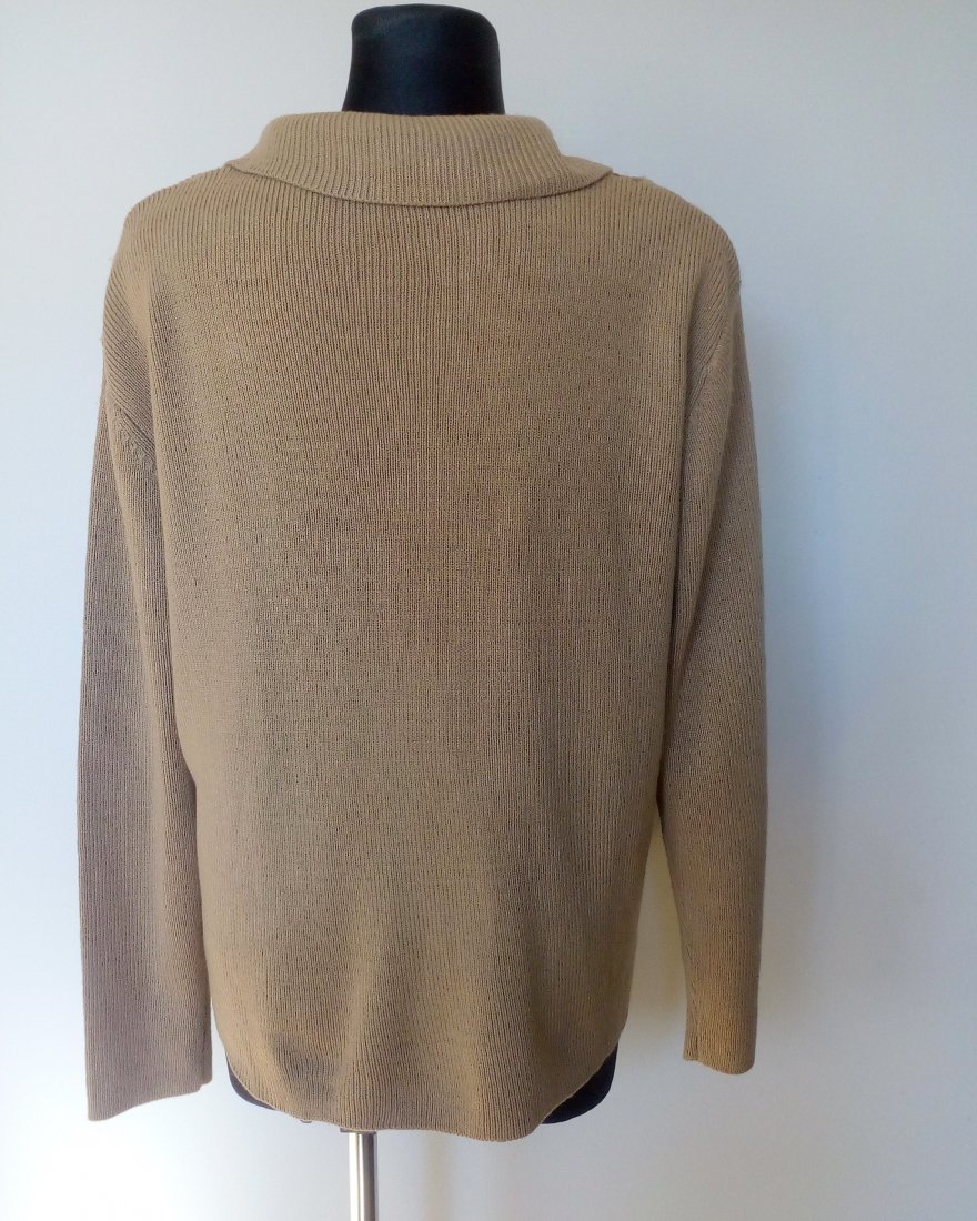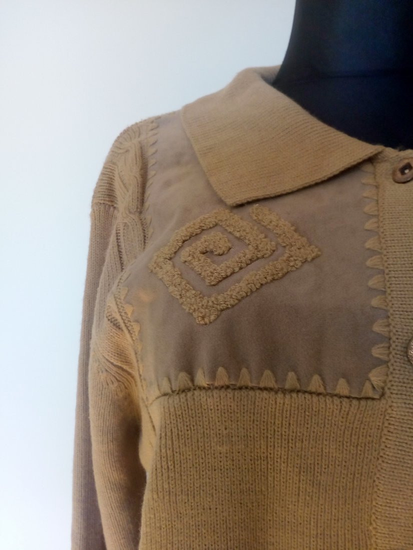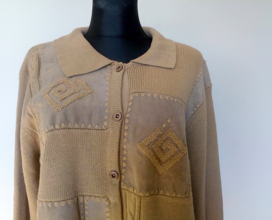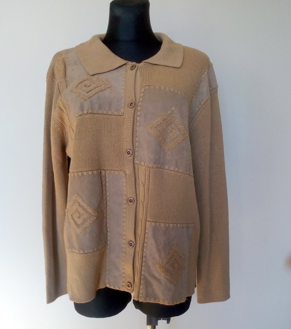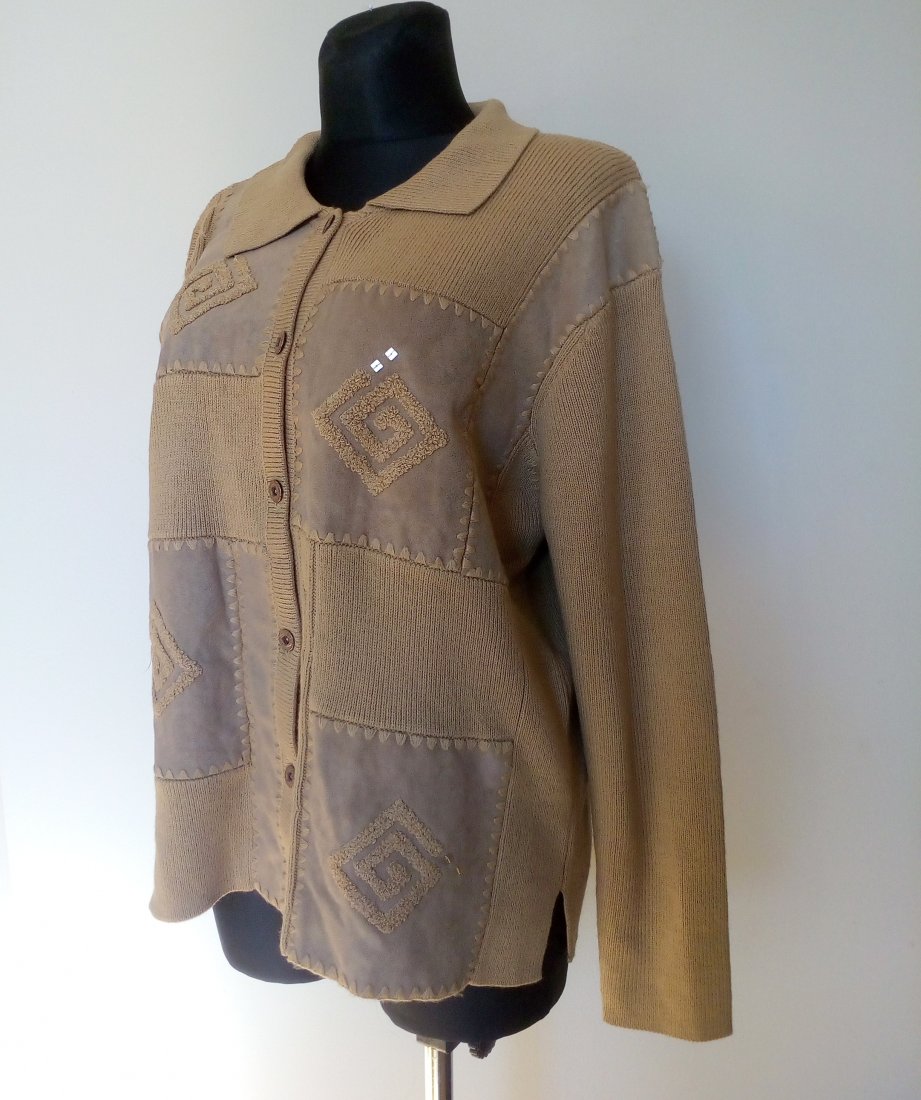 Kardigan a camelowym kolorze, z przodu wstawki z tkaniny imitującej zamsz, po bokach rozcinany, od środka zapasowy guzik i kawałek włóczki