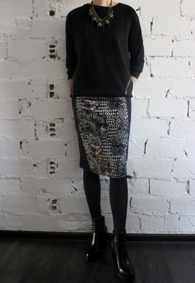 Spódnica ołówkowa. Firma Damned Delux. Rozmiar 44/XXL. Wymiary: obwód pasa-46cmx2 (rgulacja gumką), obwód bioder-48cmx2, długość spódnicy-60cm. Skład materiału: 95% wiskoza, 5% elastan.