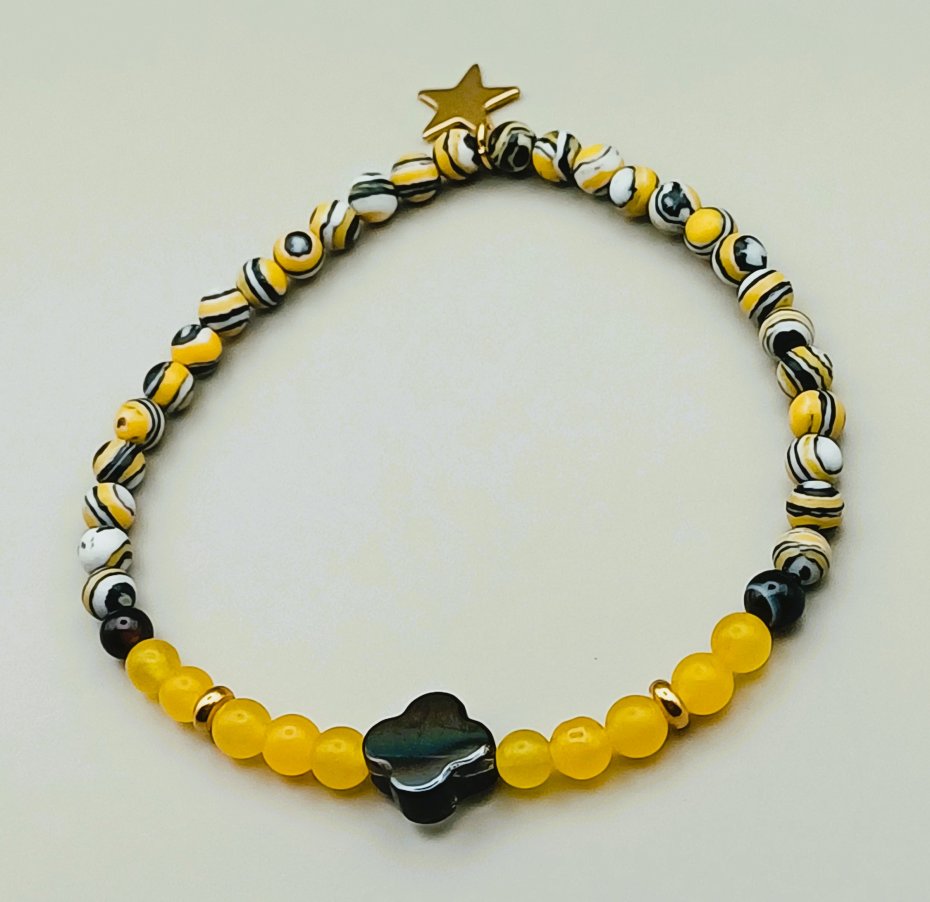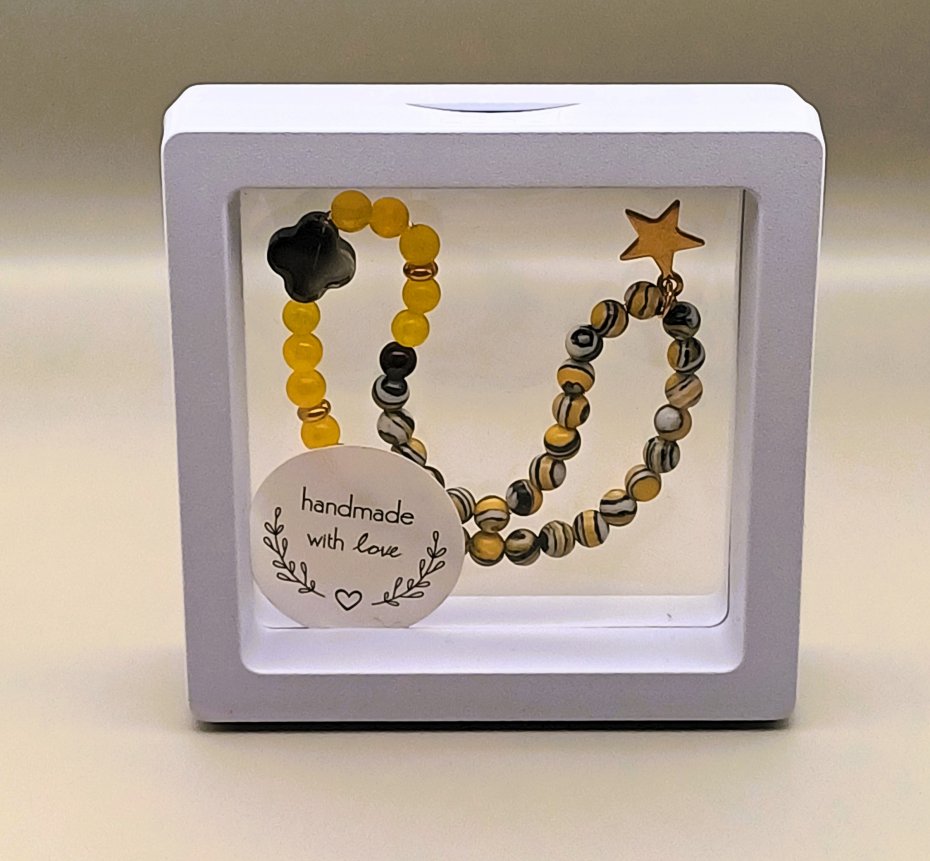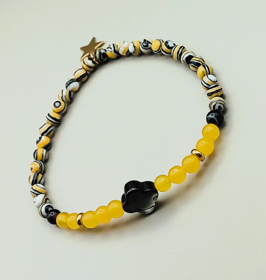 Damska bransoletka z naturalnych kamieni agatu i żółtego kamienia trzonowego.