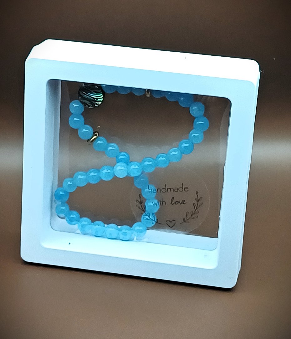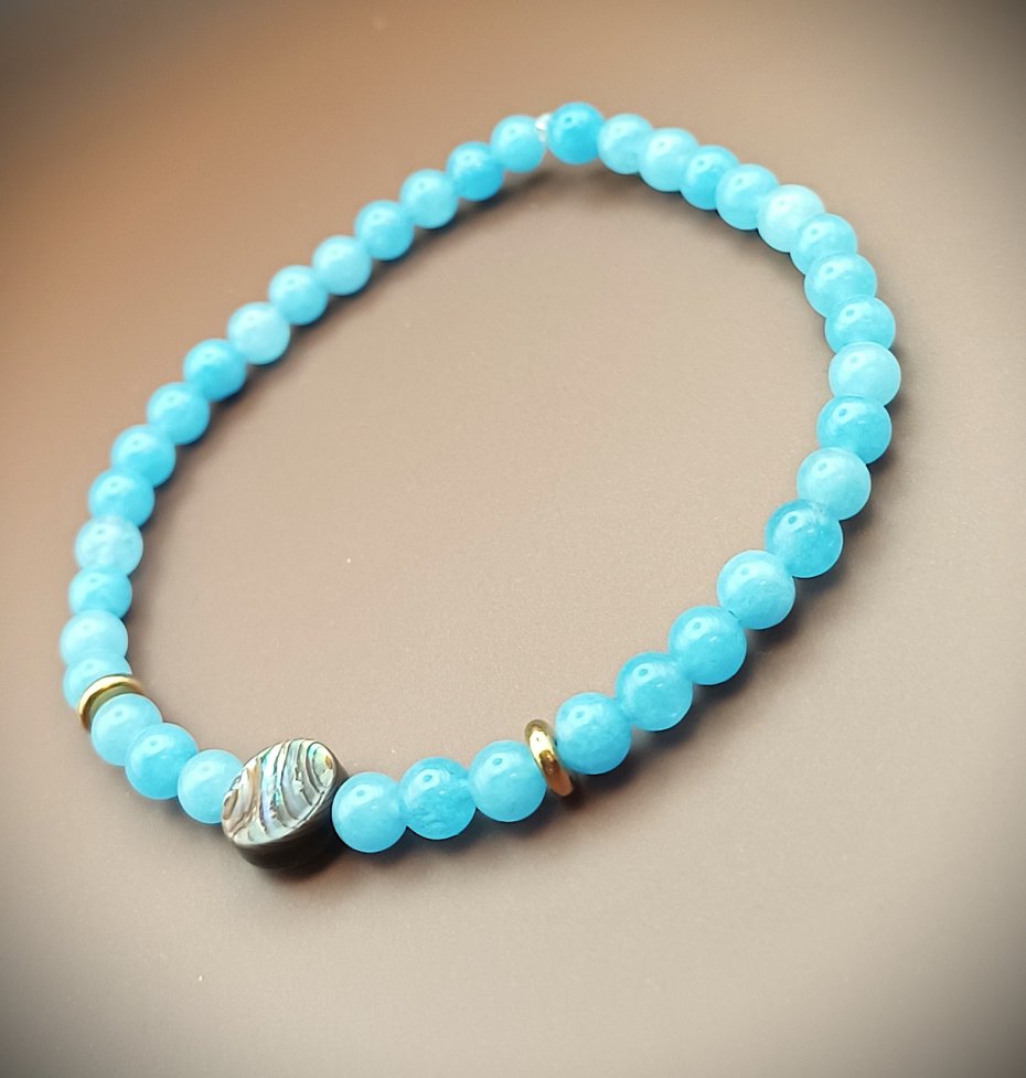Damska bransoletka z naturalnych kamieni akwamarynu, ozdobiona muszelką abalon.