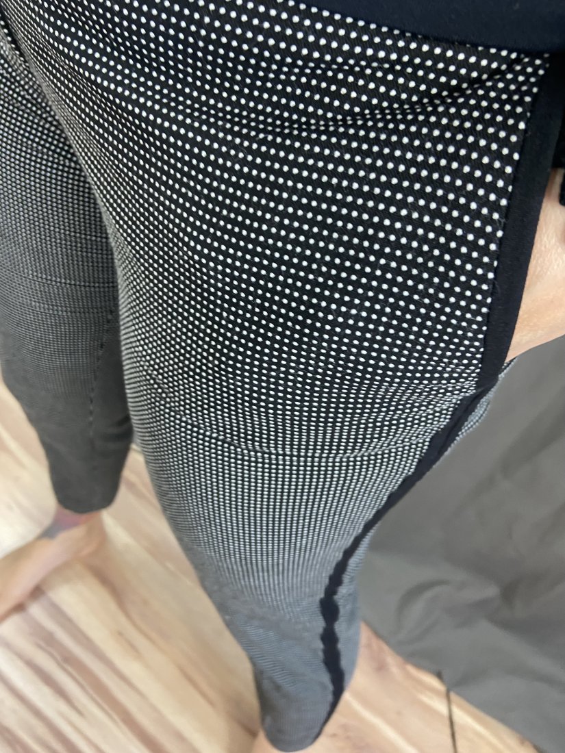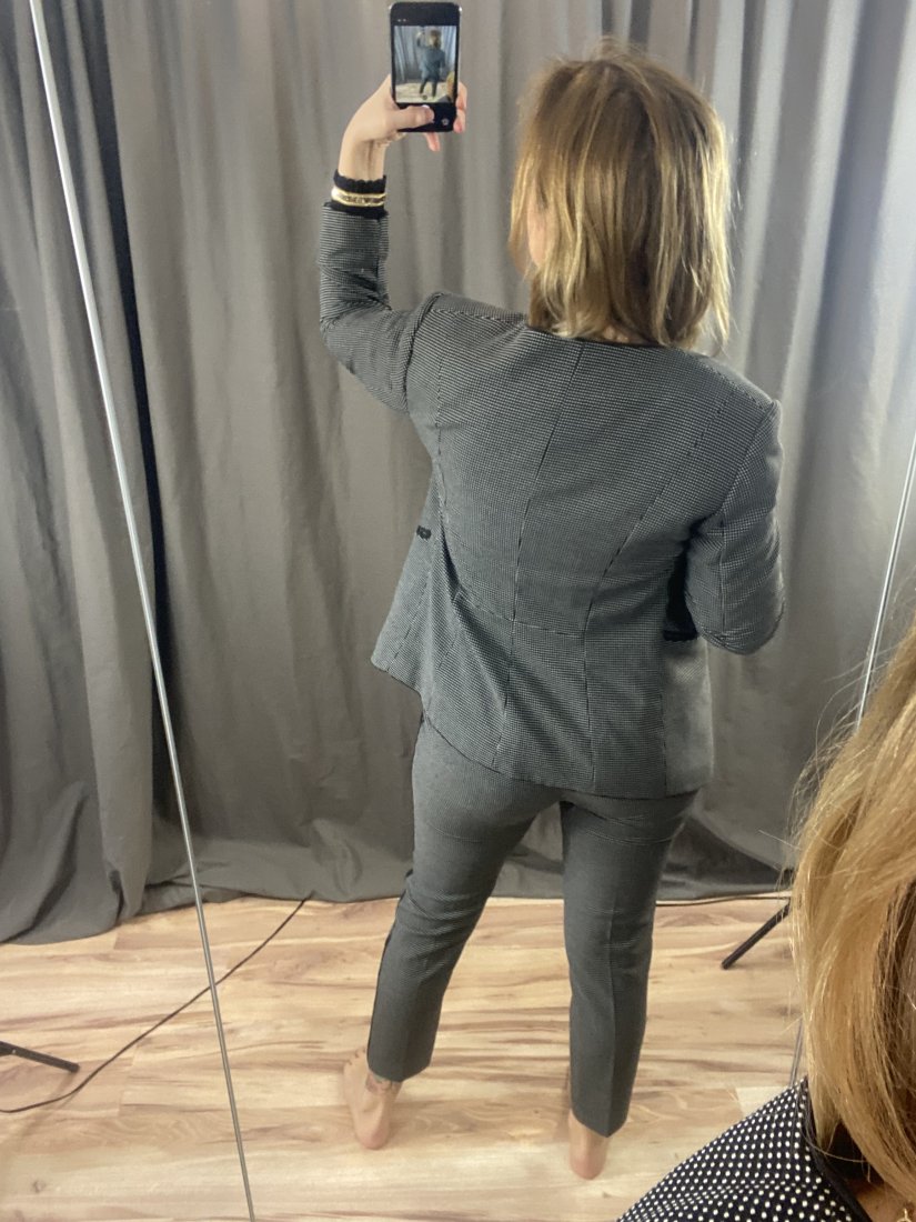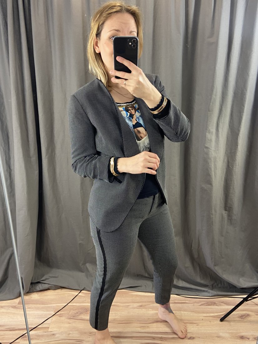 Boski gatnitur w lekkie kropeczki, spodnie z lampasem. Dopasowan, elastyczne.67% poliester, 32% wiskoza, 1% elastyna. Żakiet na podszewce.