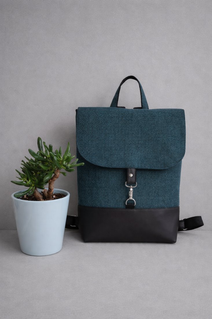 Plecak uszyty z mocnych materiałów dobranych kolorystycznie. Swobodnie mieści A4. Zapięcie na karabińczyki w kolorze srebra.
