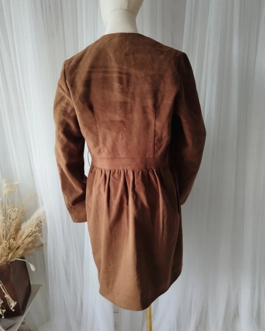 Płaszcz damski marki premium Daniele Alessandrini. Rozmiarem pasuje na S/M.Pachy 48x2, talia 40x2, biodra 53x2, długość 93cm,Piękny głęboki brązowy kolor, świetny krój. Doskonale skrojony, rewelacyjnie uszyty, wspaniałe detale. Po bokach kieszenie. Materiał niezwykłe przyjemny w dotyku. Skład bawełna oraz wiskoza. Jedyny minus brak haftek i paska. Płaszcz bez paska wygląda również zjawiskowo.