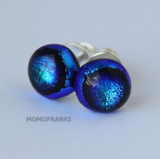 Szklane kolczyki na srebrnych sztyftach. Własnego wypału, wykonane metodą fusingu. Wielkość ok 7mm średnicy. W zależności od kąta nachylenia, łagodnie zmieniają barwę od szafirowej po szmaragdową. Niepowtarzalne! Sztyfty i baranki srebro próby 925. Polecam gorąco :)