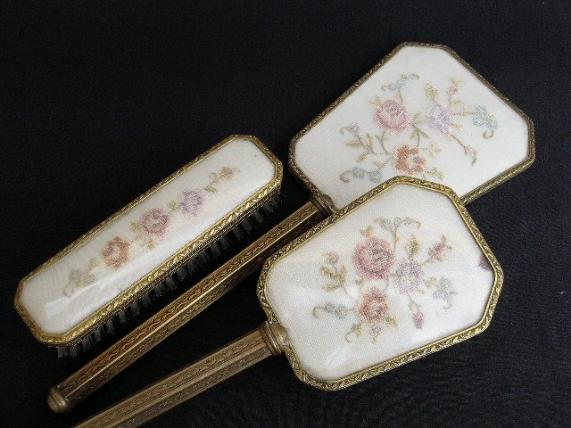 Kobiecy, stylowy kompet kosmetyczny - lusterko, szczotka i szczoteczka - wszystkie w mosiężnych dekorowanych uchwytach i z delikatnym, ręcznie haftowanym wzorem kwiatowym na ciekawym połyskującym tle. Lusterko z fazą 29,5 x 11; duża szczotka 24 x 8 x 4; szczoteczka 14 x 4 x 3,5 cm. Używany, jakościowo wykonany, włosie na drewnianej podstawie, stan zachowania dobry plus. Komplet z elegancją i dawnych lat szykiem :)