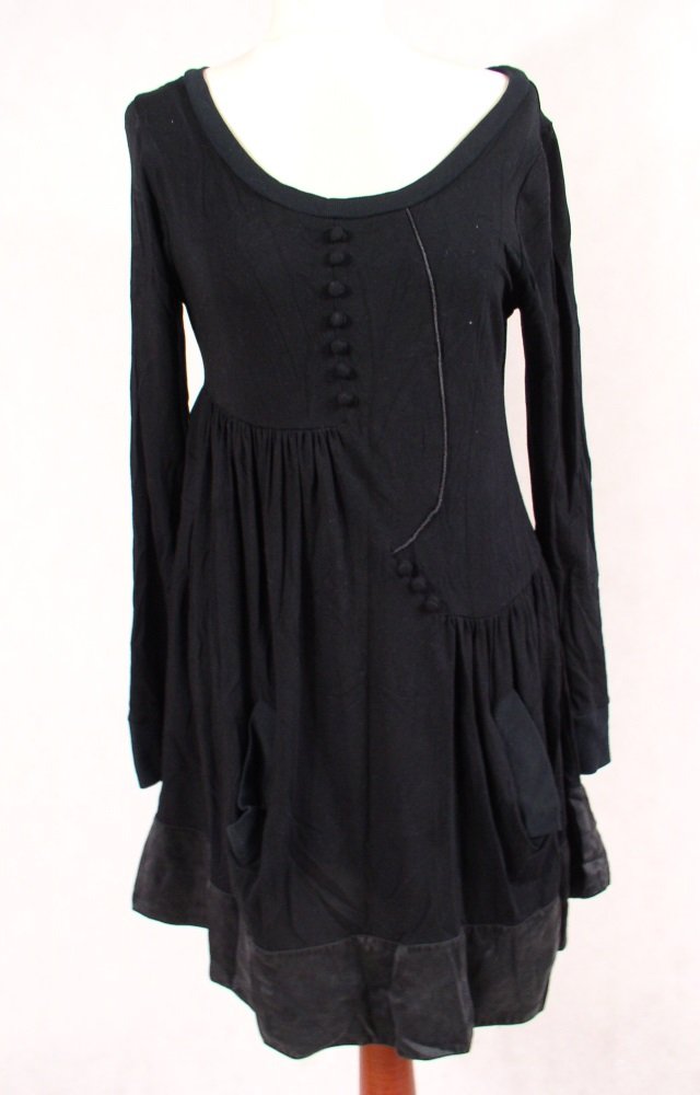 Sukienka firmy DAY.Rozmiar M.Materiał wiskoza.Dekolt okrągły.Rękaw długi,wąski z przyszytym mankietem.Cięcia i marszczenia na dwóch poziomach + guziczki.W dole dwie pionowe kieszenie.Dół wykończony doszytą plisą.Stan bardzo dobry.Długość 88 cm.pod pachami 96 cm.