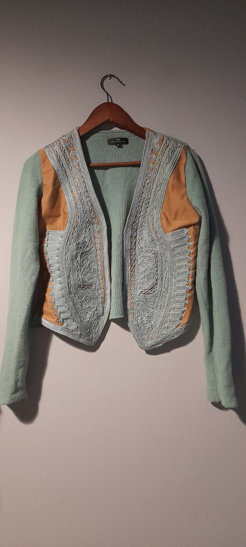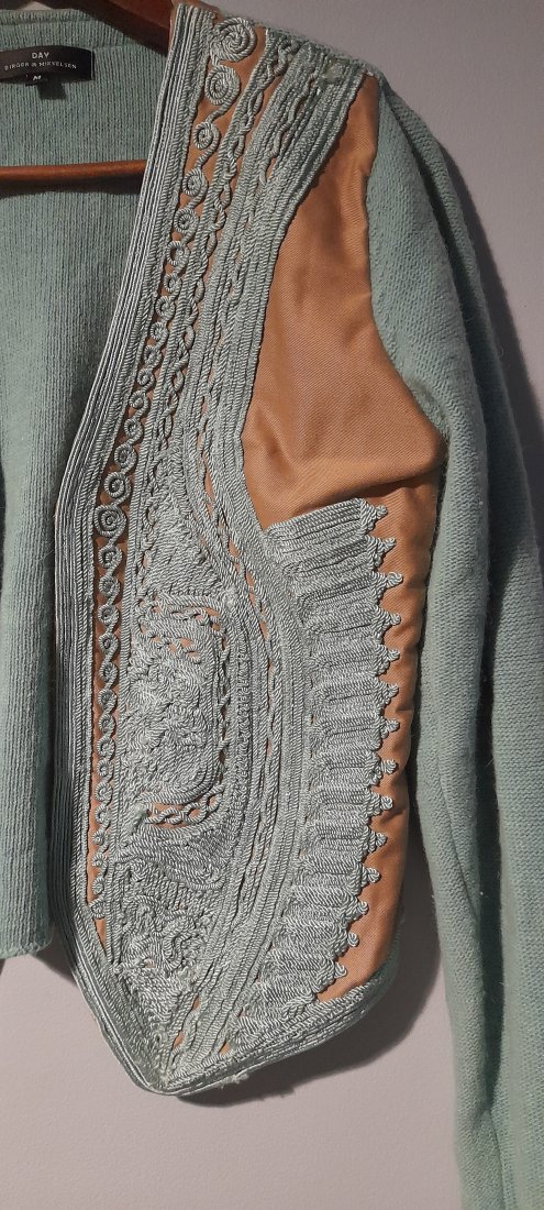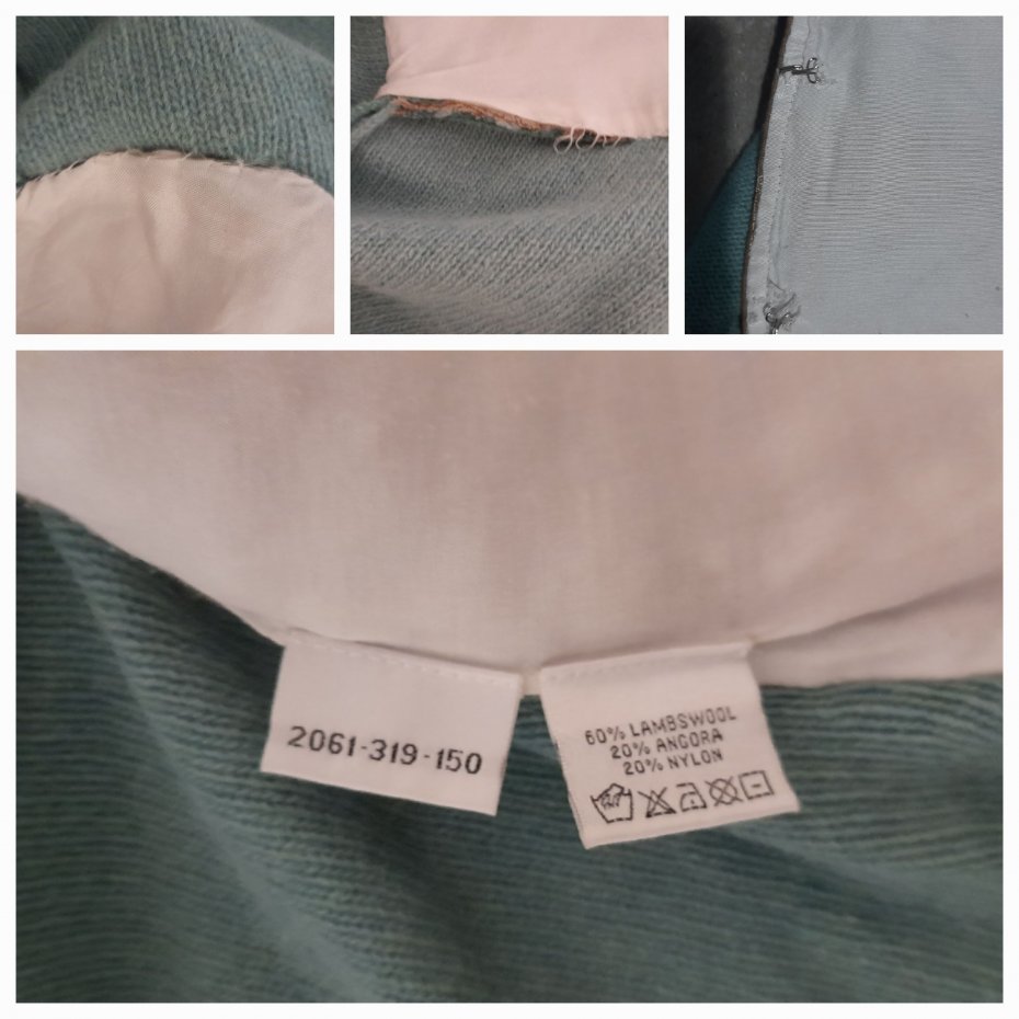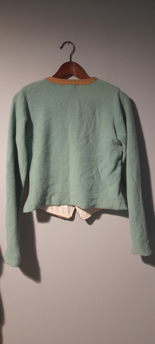 Sweter z usztywnionym haftowanym przodem, niezwykłe, efektowne połączenie żakietu I swetra, piękny kolor, doskonała jakościowo materia, unikatowy model, stan bdb, haftki do ewentualnej poprawy, niewidoczna mała niedoskonałość w szwach łączących dzianinę z elementem haftowanym, z zewnątrz idealny,długość 50, szerokość biust 42x2 ,część dzianinowa się rozciąga , więc plus kilka cm