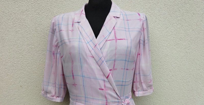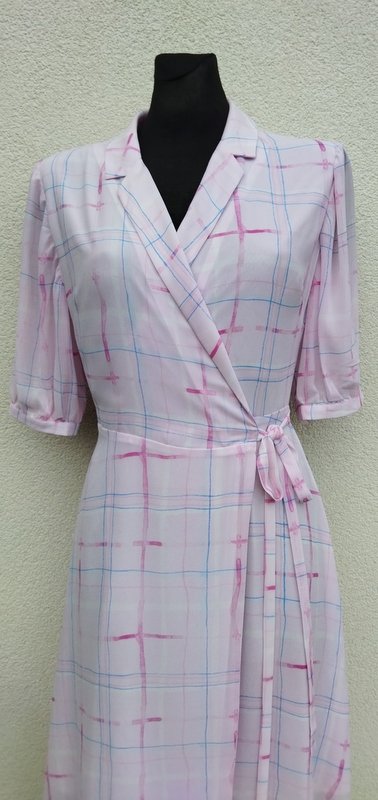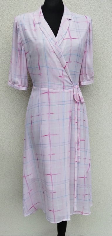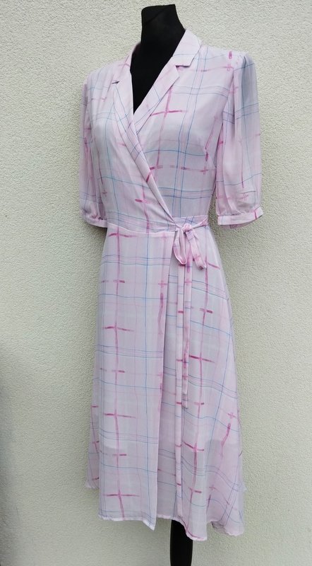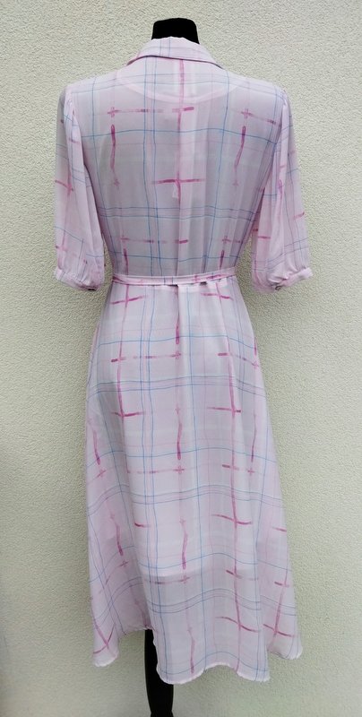 Piękna sukienka z lekko transparentnej żorżety w pastelowej kolorystyce jaśniutkiego rozbielonego różu, bieli, błękitu i wiśniowej czerwieni.zakładana kopertowa, wiązana troczkami z jednego boku, góra z kołnierzykiem z rewersami , z rękawkiem zapinanym na mankiecik z guziczkiem, dół zwiewny rozkloszowany . Na cienkiej podszewce do kolan