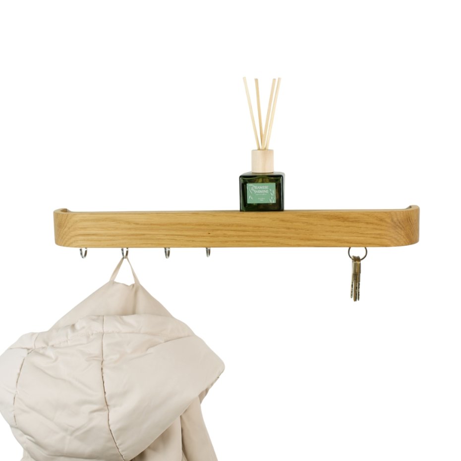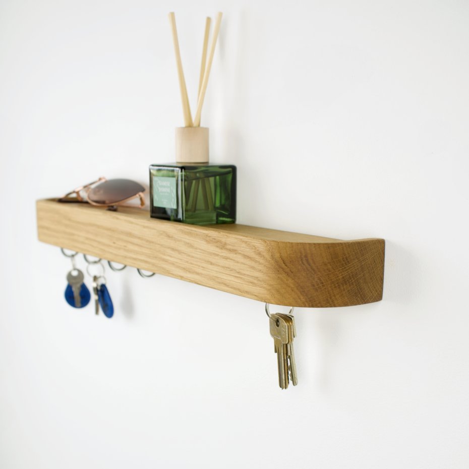 Eleganckie wgłębienie na górze – zabezpiecza przed zsuwaniem się przedmiotów i pozwala przechowywać drobiazgi takie jak małe dyfuzory zapachowe, piloty do garażu czy portfele. Każdy wieszak może sie różnić odcieniem oraz fakturą, ponieważ jest naturalne. Niezbędne kołki i śruby dołączamy do kompletu.