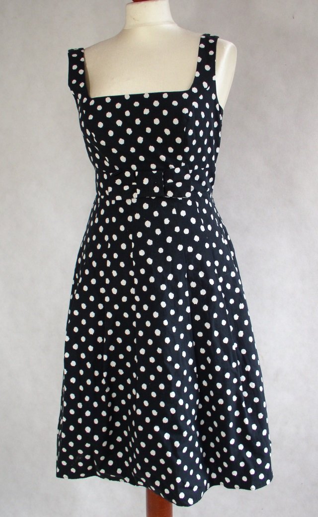Piękna sukienka firmy debut.Całość na czarnej podszewce+falbana z czarnej siateczki na dole.Zapinana z boku na zamek.Odcięta w pasie z wstawionym pasem z przodu szeroka kokarda.Spódnica z zaszytymi kontrafałdami 11 cm.Stan bardzo dobry.Długość 99 cm.pod pachami 80 cm.pas 66 cm.rozmiar 6 nasz 34.wierzch bawełna,spód syntetyk.
