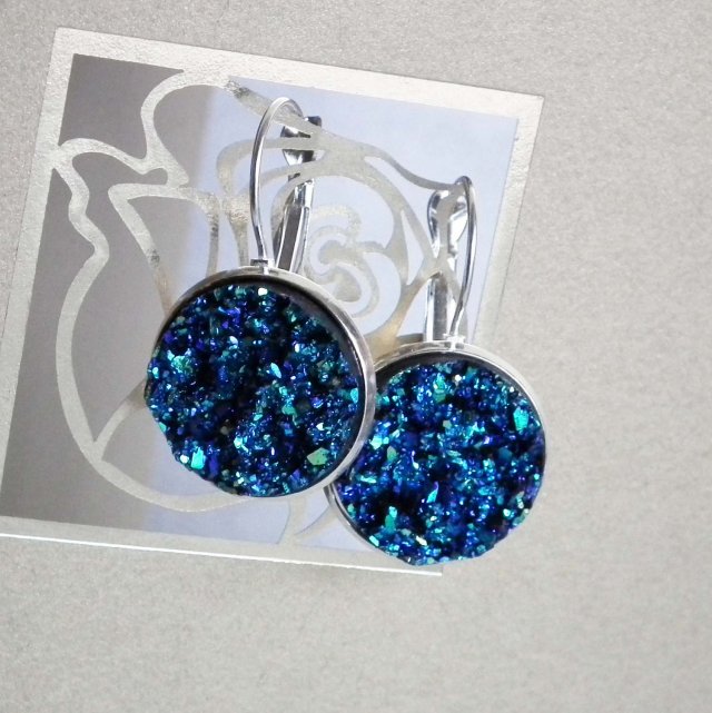 Kolczyki na biglu, z oczkami z żywicy akrylowej druzy, która piękne błyszczy barwami od głębokiego błękitu po zieleń o odcieniach morskiej toni.