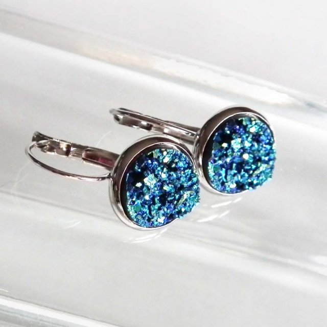 Małe, krótkie kolczyki z żywicą akrylową typu ''druzy'', która piękne błyszczy barwami od głębokiego błękitu po zieleń o odcieniach morskiej toni.
