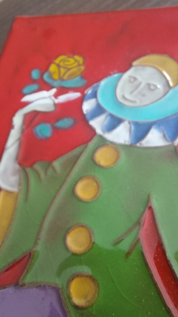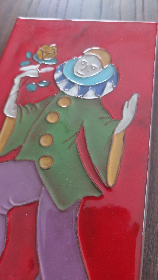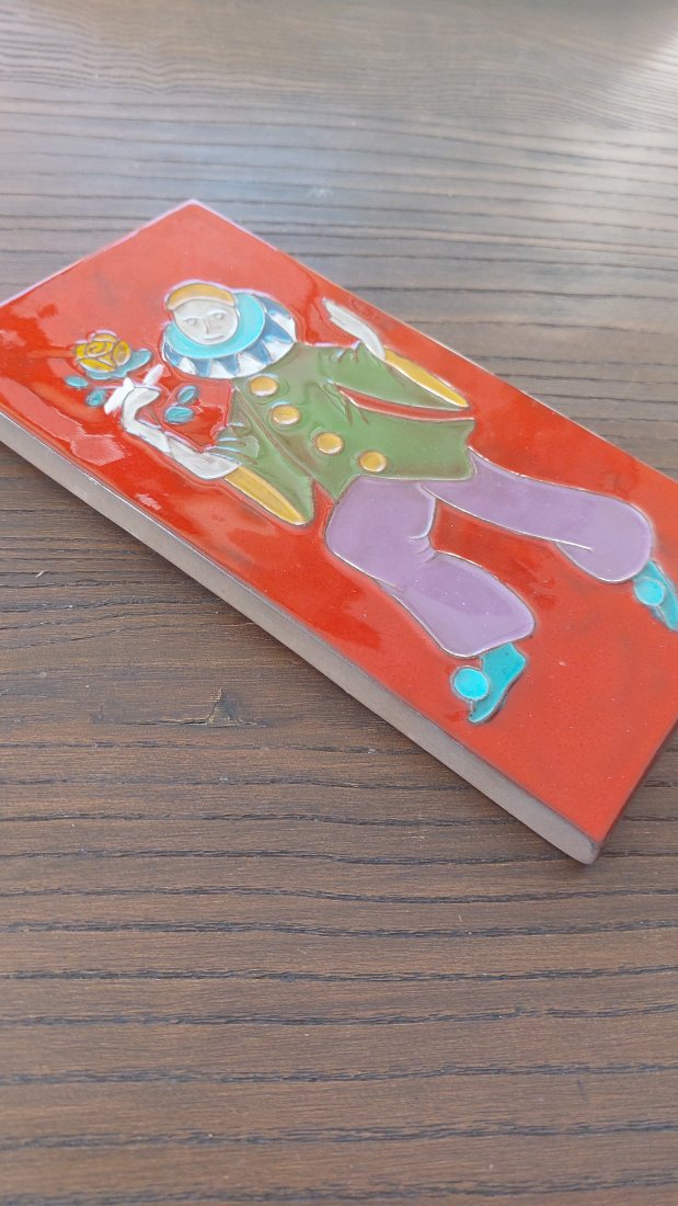 Ceramiczna płyta ścienna z reliefowym wzorem, pokryta glazurą. Zachowana w dobrym stanie.