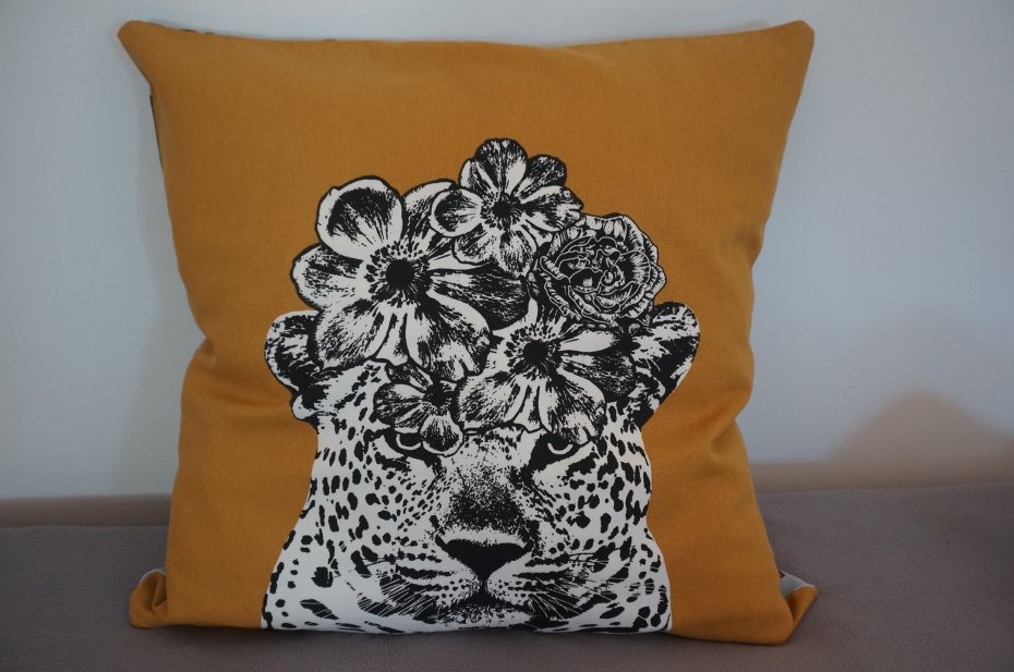 Zabawna, wyrazista poszewka na poduszkę inspirowana darami natury. Stylizowany lampart na ciemnożółtym tle z jednej strony i pszczoły na jasnoniebieskim tle z drugiej. Wystarczy odwrócić poduszkę, aby zmienić wygląd. Zapinana na suwak. Tkanina bawełniana. Stan bardzo dobry. /Posiadam 2 sztuki , cena dotyczy 1 szt/