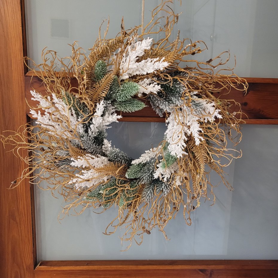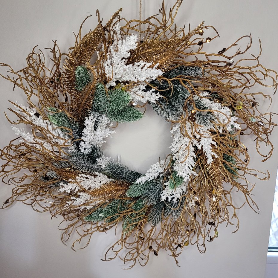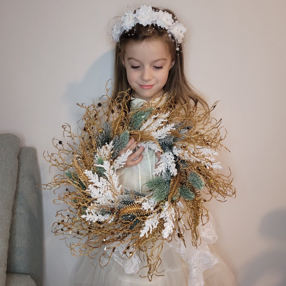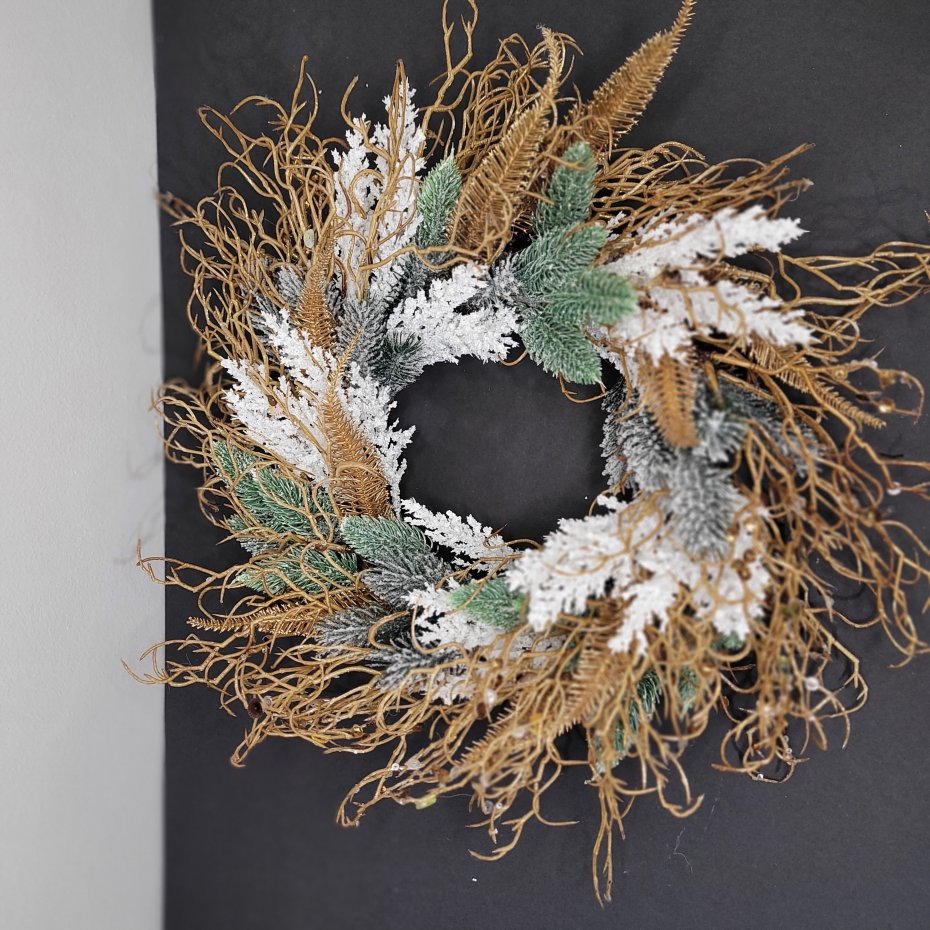 Wyjątkowy wianek, który doda elegancji i magii każdemu wnętrzu! Wykonany z dbałością o każdy szczegół, łączy złote, zielone i białe elementy, tworząc zachwycającą ozdobę w świątecznym klimacie.