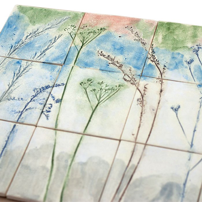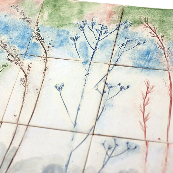Rośliny odciskane na kaflach mogą się różnić od tych na zdjęciu, w zależności od ich aktualnej dostępności. Użyte rośliny będą takie same lub podobne, przy zachowaniu ogólnej kompozycji obrazu na dekorach.