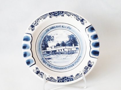 Talerz firmy Delft produkcji holenderskiej. Na taletrzu namalowany ręcznie motyw budynku z tarasem i krzesłami. Malatura w kolorze niebieskim. Wokół motyw kwiatowy. Po bokach po cztery wgłębienia. Pod spodem sygnowany. Stan bardzo dobry.