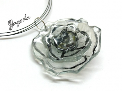 Piękny szklany wisior w kształcie róży. Kwiat o średnicy ok. 4 cm w delikatnym stalowo-szarym kolorze z dodatkiem czerni. Wisior zawieszony na wiązce czarnych linek jubilerskich o długości 43 cm. Polecam!