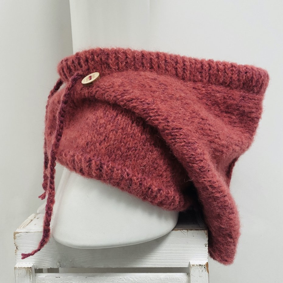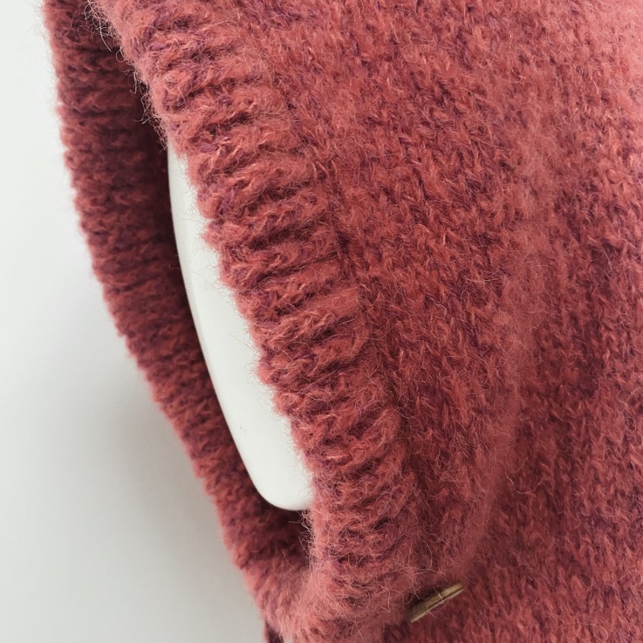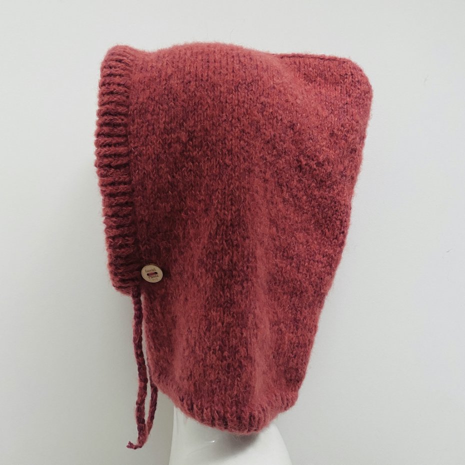 Druga to 77% alpaka i 23% jedwab morwowy, w kolorze koralowym. Połączenie obu włóczek sprawia, że balaclava jest niesamowicie miękka i lekka, a luźny fason kapturo-komina zapewnia komfort noszenia bez uczucia ucisku. Nie straszna mu też żadna fryzura :)