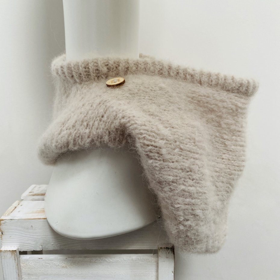 Delikatną kominiarkę oversize wykonałam ręcznie na drutach z luksusowej mieszanki wełny merynosów i brushed alpaca: 71% alpaka, 25% merino, 4% poliamid (zwiększa wytrzymałość i trwałość przędzy) w kolorze marcepanu. Włóczka ta posiada certyfikat Oeko-Tex® (certyfikat nr 23.HPE.36896), Standard 100, Klasa II, wydany przez Hohenstein Institute. Oznacza to, że została zbadana na obecność substancji szkodliwych i została uznana za bezpieczną pod względem ekologicznym. Klasa II oznacza, że włóczka jest odpowiednia na artykuły pozostające w bezpośrednim kontakcie ze skórą .