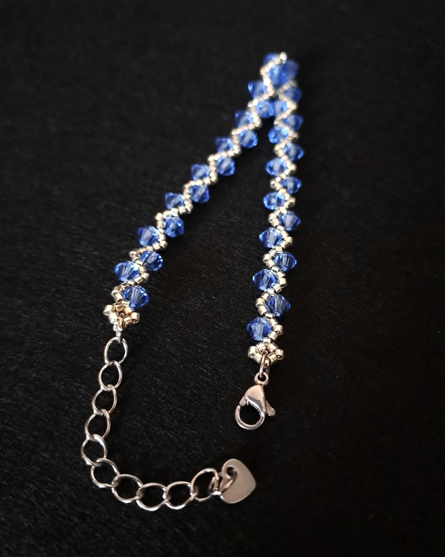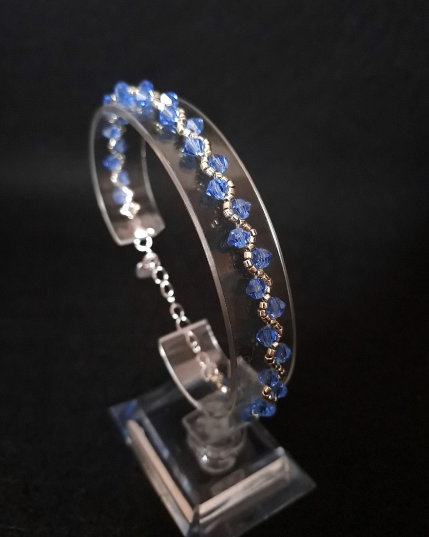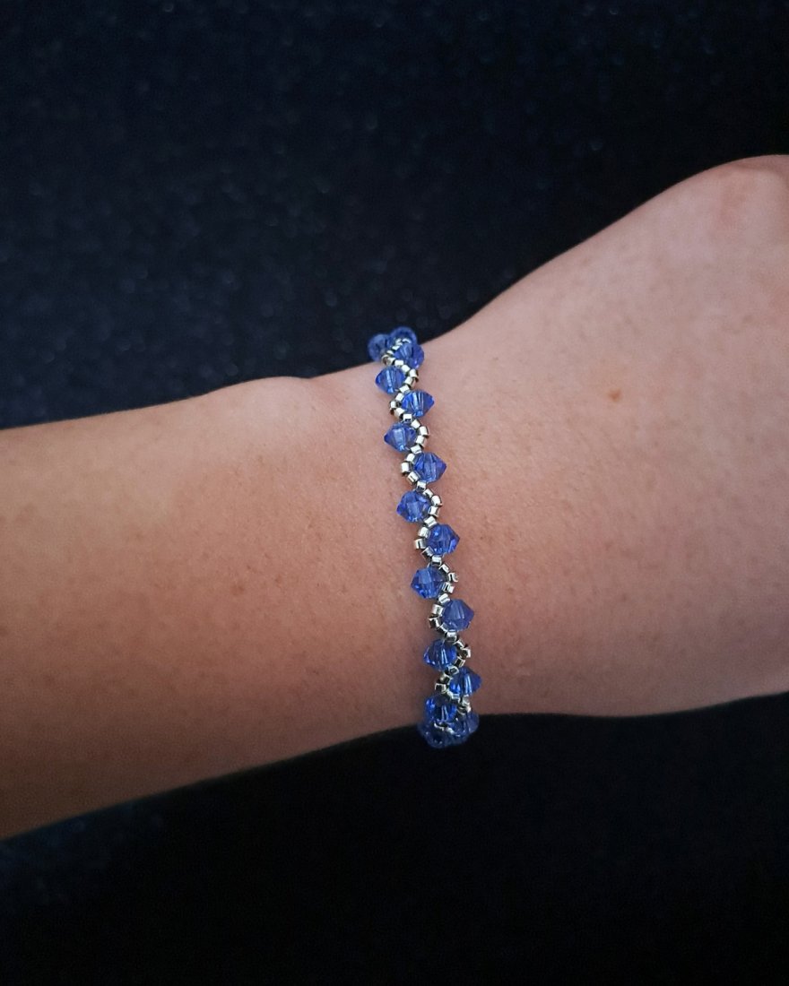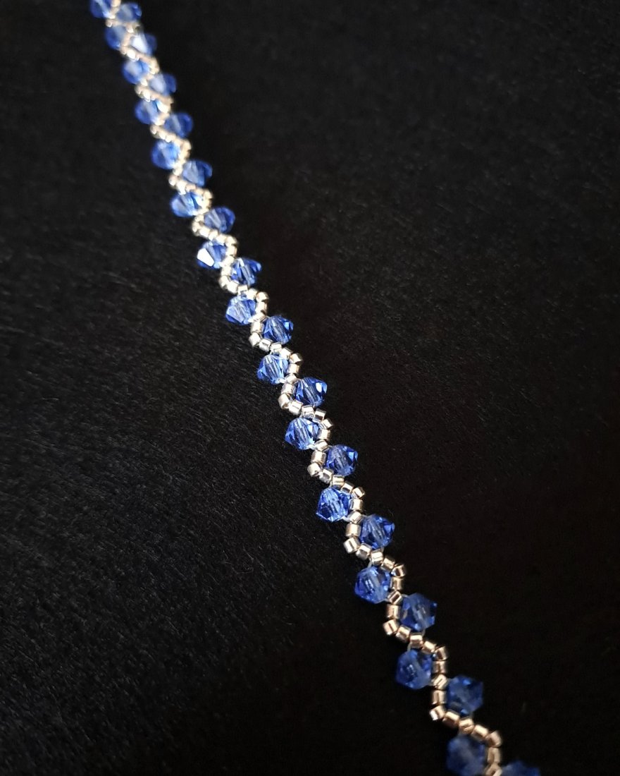 Sapphire Clarity to bransoletka stworzona z myślą o tych, które cenią prostotę podaną z absolutną dbałością o detal. W tym projekcie wszystko ma swoje miejsce: srebrne koraliki Miyuki Delica tworzą ramę, a niebieskie kryształki Preciosa nadają kompozycji niebanalny wygląd.