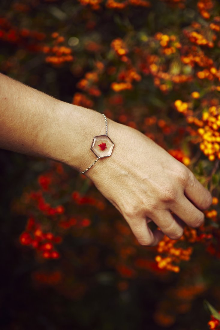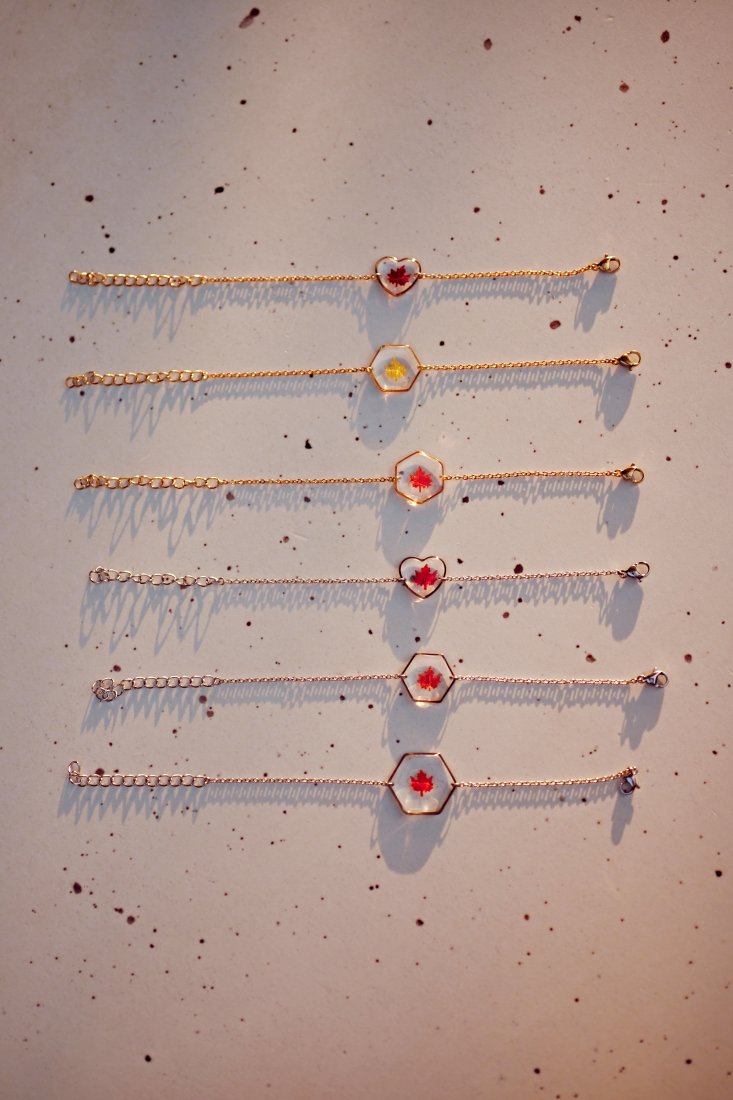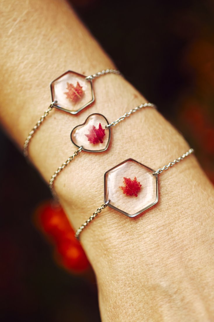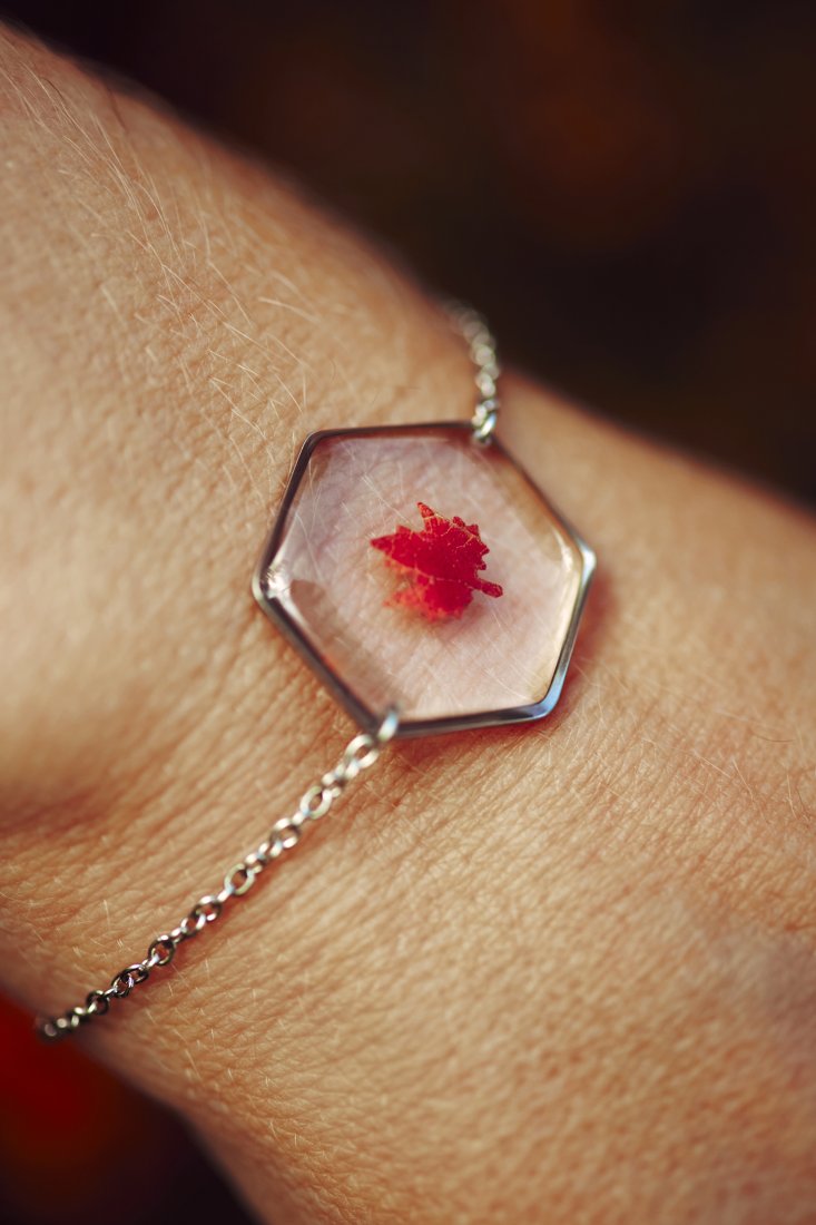 Wyjątkowa bransoletka, wypełniona delikatnymi płatkami pięknymi listkami klonu drobnolistnego, który został uchwycony w krystalicznie czystej żywicy jubilerskiej.