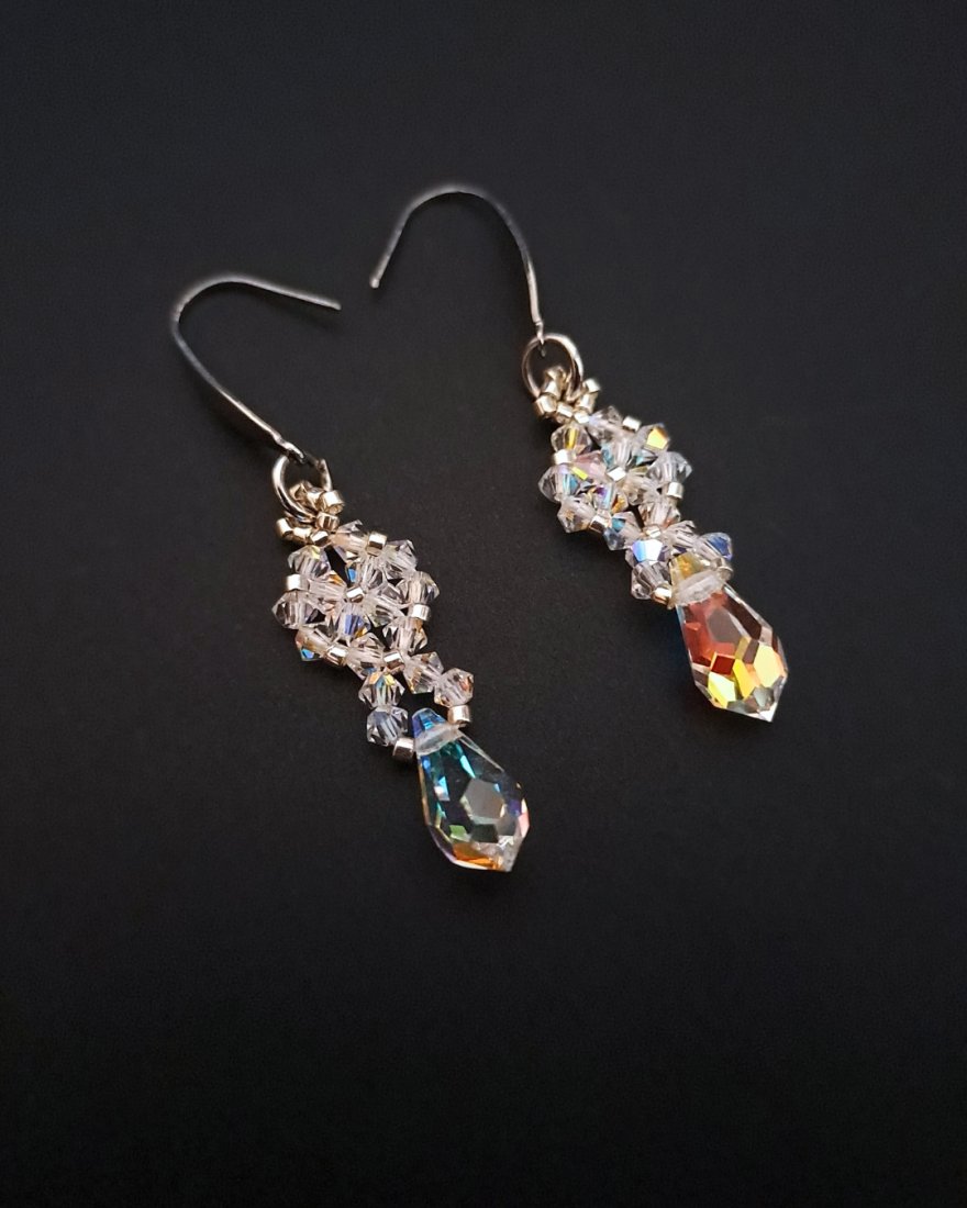 Ręcznie wykonane z kryształków Preciosa Crystal AB i srebrnych koralików Miyuki Delica, w kształcie łezki, która miękko oprawia twarz. Ich lekki połysk odbija światło, dodając elegancji i świeżości, nie przytłaczając przy tym stylizacji.
