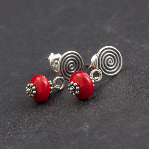Oponki czerwonego korala (8 mm) zawieszone na ozdobnych sztyftach "ślimaczkach" (9 mm). Długość całkowita kolczyków 2,2 cm. Kolczyki są ozdobnie zapakowane.