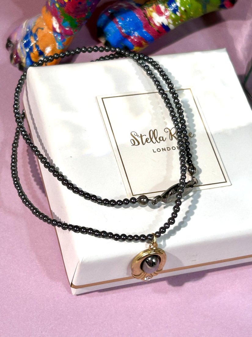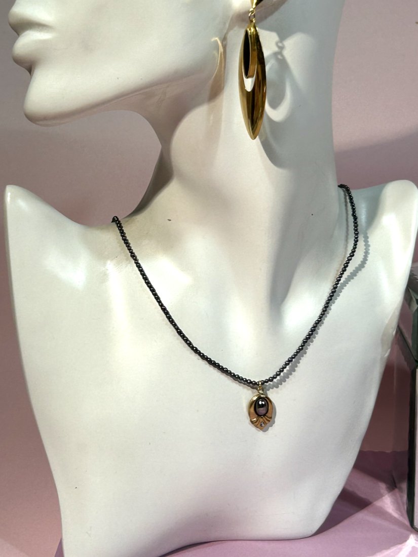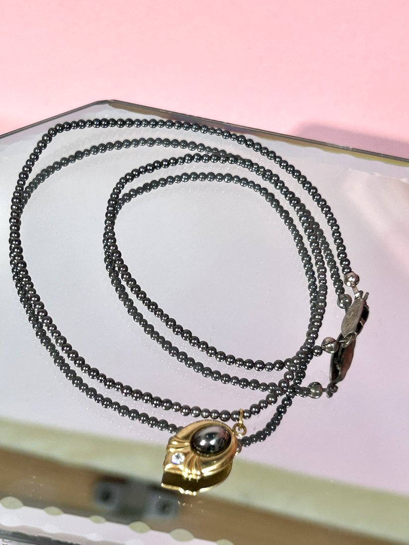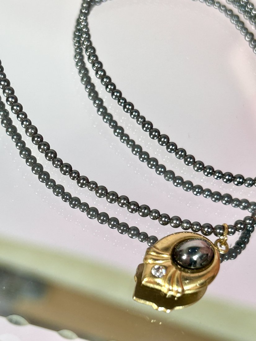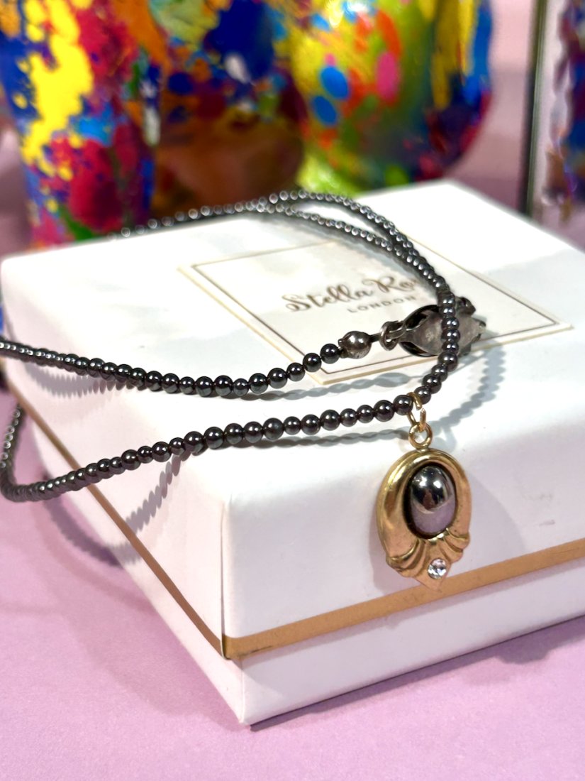 Naszyjnik ma zawieszkę pozłacaną z większych hematytem w owalnym wisiorku - inspirowanym stylem edwardiańskim.