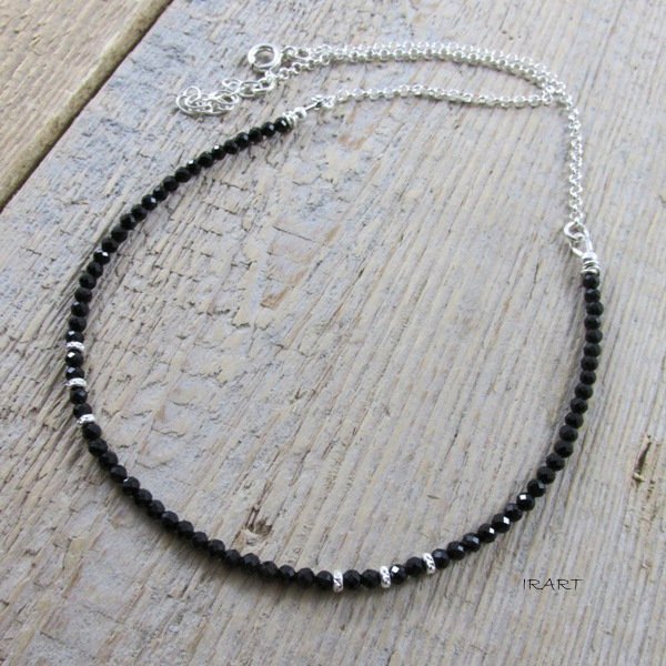 Naszyjnik wykonany z fasetowanych kul czarnego turmalinu ok. 3 mm. Całość oprawiona w srebro 925. Długość naszyjnika wynosi 44,5 cm, plus łańcuszek regulacyjny 4,5 cm. Kamienie stanowią ok 22 cm. Elegancko zapakowany.