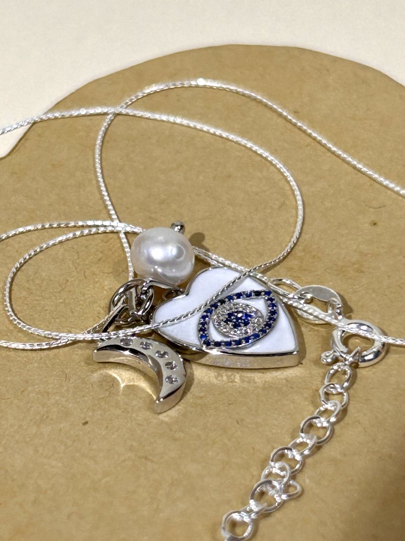 Prześliczny naszyjnik z potrójnym wisiorkiem. Srebro, emalia i naturalna perła słodkowodna.
