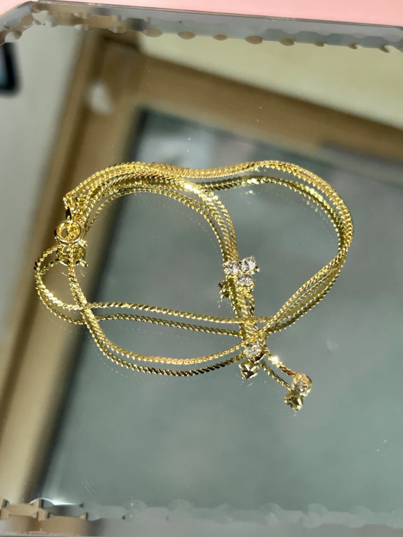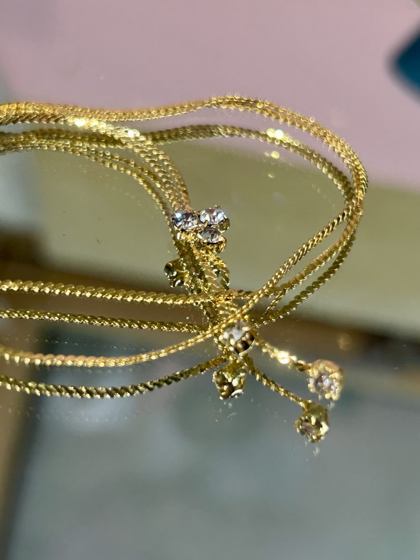 Delikatny splot łańcuszka zakończony lśniącą ozdobą ze szkła kryształowego.