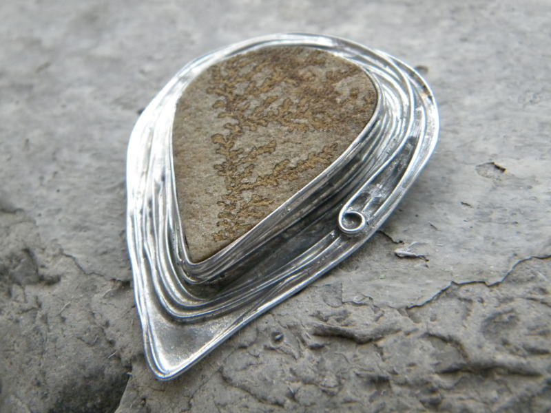 broszka wykonana z miedzi, cyny i jaspisów. wymiary ok. 6 na 1.5 m. za...