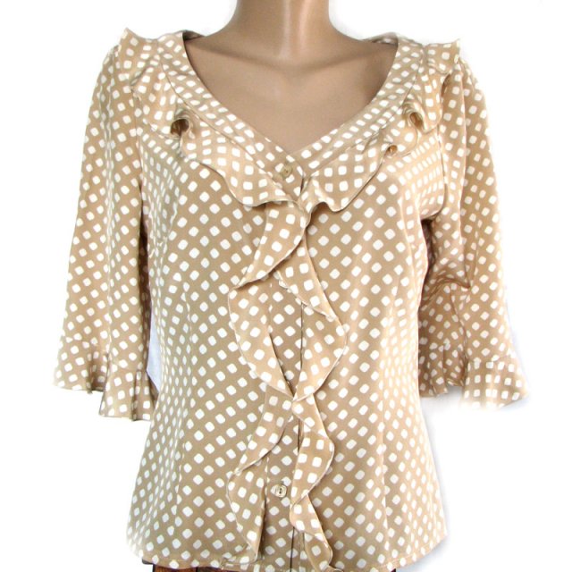 Bluzka firmy DENI CLER, zapinana z przodu na guziczki, przy dekolcie i zapięciu falbana. Rękaw 3/4 o długości 22 cm (mierzony po wewnętrznej stronie. Materiał cienki, przewiewny.