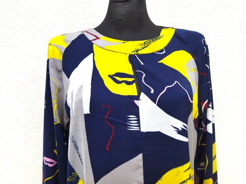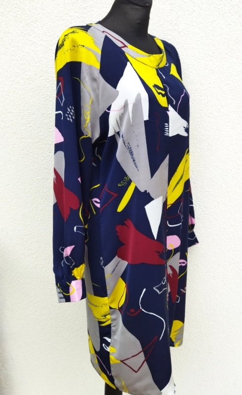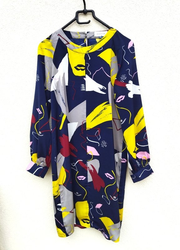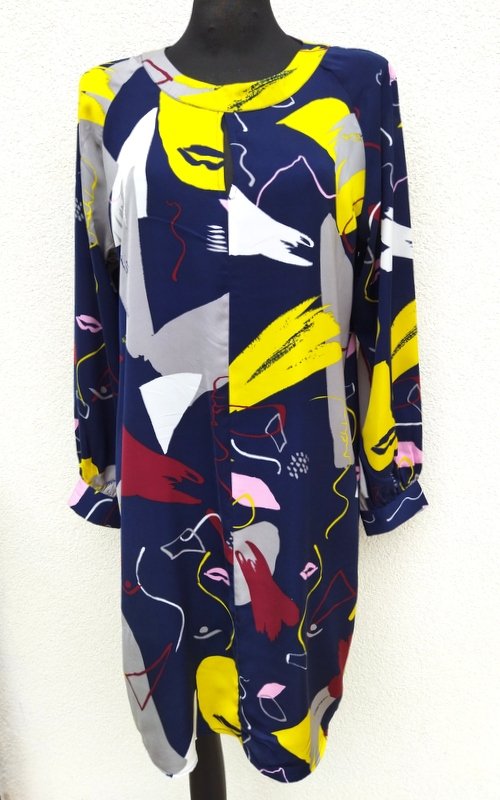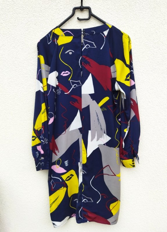 Sukienka z miłej tkaniny poliestrowej z wzorami a' la Picasso w żywych kolorach. Lekko taliowana z owalnym dekoltem obszytym pliską z łezką z przodu, rękawy raglanowe z mankietem na trzy guziczki,. zapinana na plecach ma dwa guziczki. bez podszewki - nie prześwieca