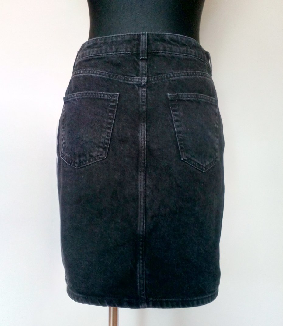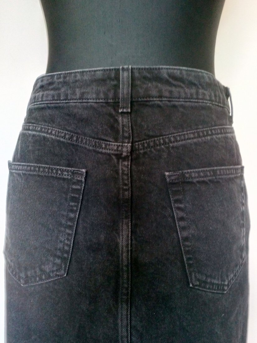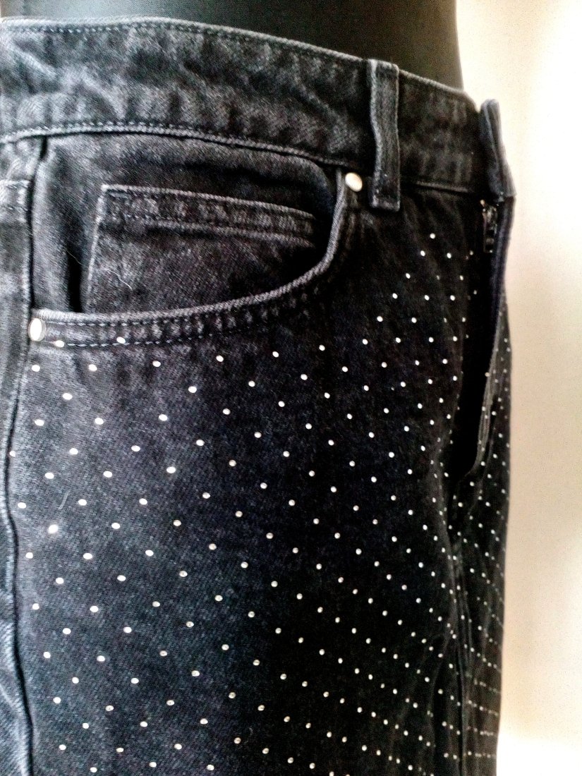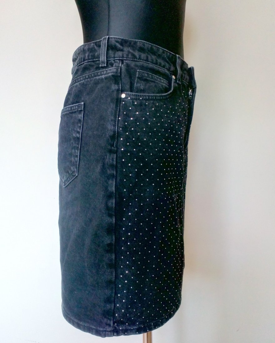 Jeansowa spódnica w czarnym kolorze z drobnymi cyrkoniami na przodzie, u góry na pasku ze szlufkami, zapinana z przodu na kryty zamek i guzik, po bokach przodu półokrągło wpuszczane kieszenie, w tle trójkątny karczek i dwie naszywane kieszenie, całość bez podszewki
