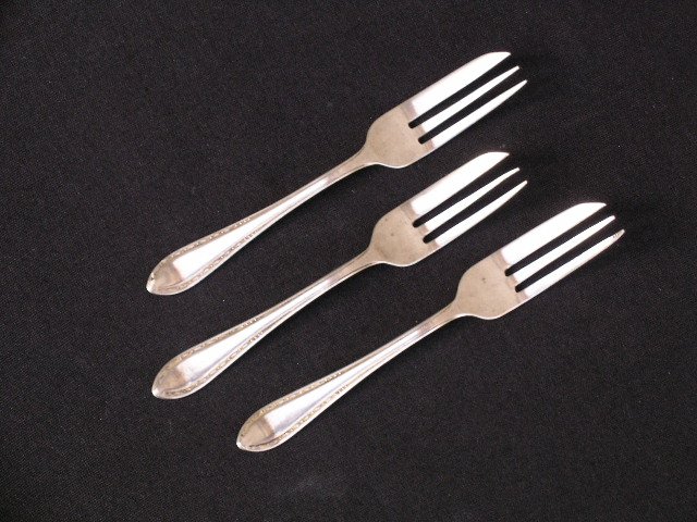 Dawnej daty widelczyki deserowe - electroplated nickel silver - nikiel i srebrzony plater. Ładna forma i eleganckie zdobienie uchwytów. 13,5 x 1,7 cm. Stan zachowania dobry.