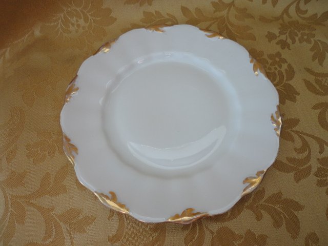Porcelanowy talerzyk deserowy, sygnowany. Kolor biały, brzeg nieregularny, miejscowo złocony. Uroczy, ozdobny, w stylu pałacowym.
